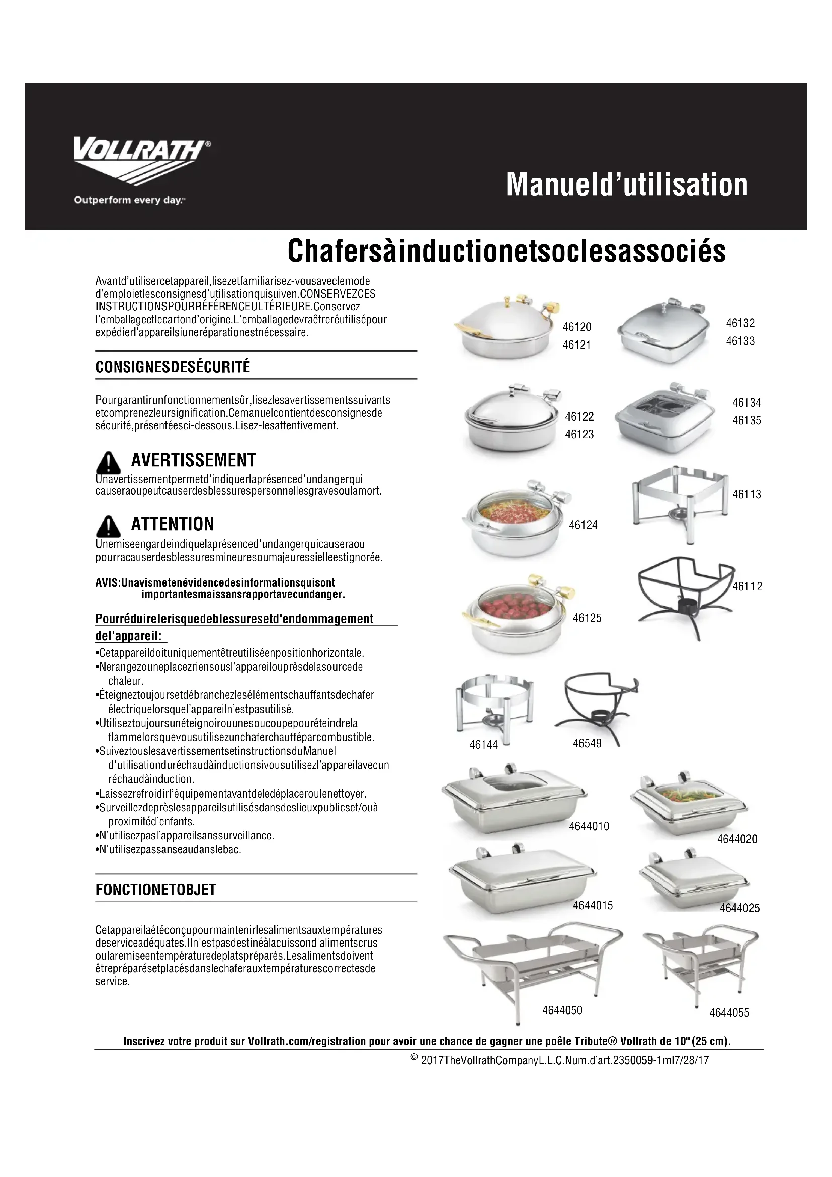 2017 The Vollrath Company L.L.C. Num. d’art. 2350059-1 ml 7/28/17 Inscrivez votre produit sur Vollrath.com/registration pour avoir une chance de gagner une poêle Tribute® Vollrath de 10" (25 cm). Avant d’utiliser cet appareil, lisez et familiarisez-vous avec le mode d’emploi et les consignes d’utilisation qui suiven. CONSERVEZ CES INSTRUCTIONS POUR RÉFÉRENCE ULTÉRIEURE. Conservez l’emballage et le carton d’origine. L'emballage devra être réutilisé pour expédier l’appareil si une réparation est nécessaire.