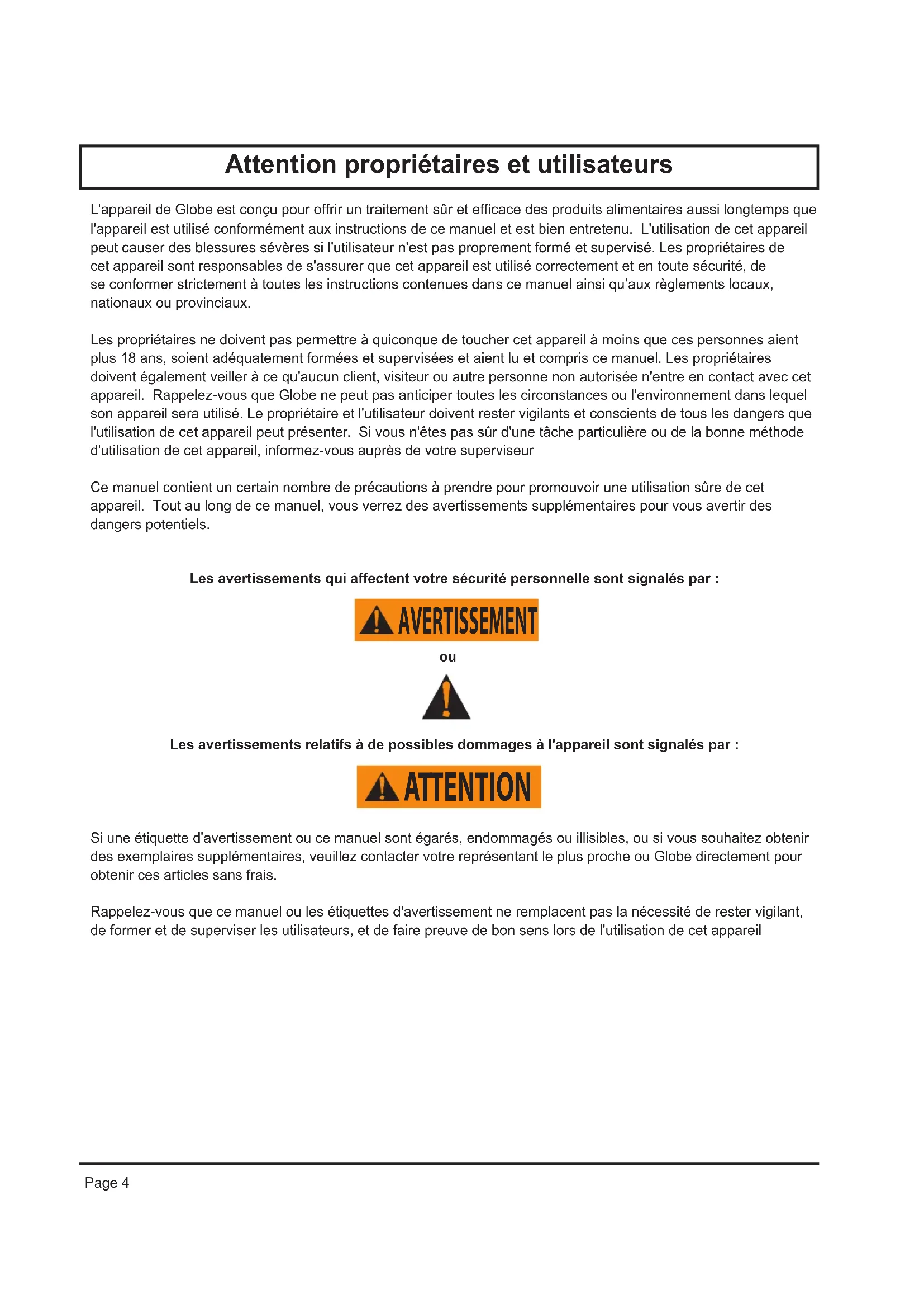COURRIEL : info@globefoodequip.com SITE WEB : www.globefoodequip.com © Globe Food Equipment Company, 2018 980160 Ver. 3 Rev. -_2018 Table des matièresPage 4 L'appareil de Globe est conçu pour offrir un traitement sûr et efcace des produits alimentaires aussi longtemps que l'appareil est utilisé conformément aux instructions de ce manuel et est bien entretenu. L'utilisation de cet appareil peut causer des blessures sévères si l'utilisateur n'est pas proprement formé et supervisé. Les propriétaires de cet appareil sont responsables de s'assurer que cet appareil est utilisé correctement et en toute sécurité, de se conformer strictement à toutes les instructions contenues dans ce manuel ainsi qu’aux règlements locaux, nationaux ou provinciaux. Les propriétaires ne doivent pas permettre à quiconque de toucher cet appareil à moins que ces personnes aient plus 18 ans, soient adéquatement formées et supervisées et aient lu et compris ce manuel. Les propriétaires doivent également veiller à ce qu'aucun client, visiteur ou autre personne non autorisée n'entre en contact avec cet appareil. Rappelez-vous que Globe ne peut pas anticiper toutes les circonstances ou l'environnement dans lequel son appareil sera utilisé. Le propriétaire et l'utilisateur doivent rester vigilants et conscients de tous les dangers que l'utilisation de cet appareil peut présenter. Si vous n'êtes pas sûr d'une tâche particulière ou de la bonne méthode d'utilisation de cet appareil, informez-vous auprès de votre superviseur Ce manuel contient un certain nombre de précautions à prendre pour promouvoir une utilisation sûre de cet appareil. Tout au long de ce manuel, vous verrez des avertissements supplémentaires pour vous avertir des dangers potentiels. Les avertissements qui affectent votre sécurité personnelle sont signalés par : Les avertissements relatifs à de possibles dommages à l'appareil sont signalés par : Si une étiquette d'avertissement ou ce manuel sont égarés, endommagés ou illisibles, ou si vous souhaitez obtenir des exemplaires supplémentaires, veuillez contacter votre représentant le plus proche ou Globe directement pour obtenir ces articles sans frais. Rappelez-vous que ce manuel ou les étiquettes d'avertissement ne remplacent pas la nécessité de rester vigilant, de former et de superviser les utilisateurs, et de faire preuve de bon sens lors de l'utilisation de cet appareil Attention propriétaires et utilisateurs AVERTISSEMENT AT TENTION ouPage 5 Composants principaux du batteur mélangeur VUE FRONTALE