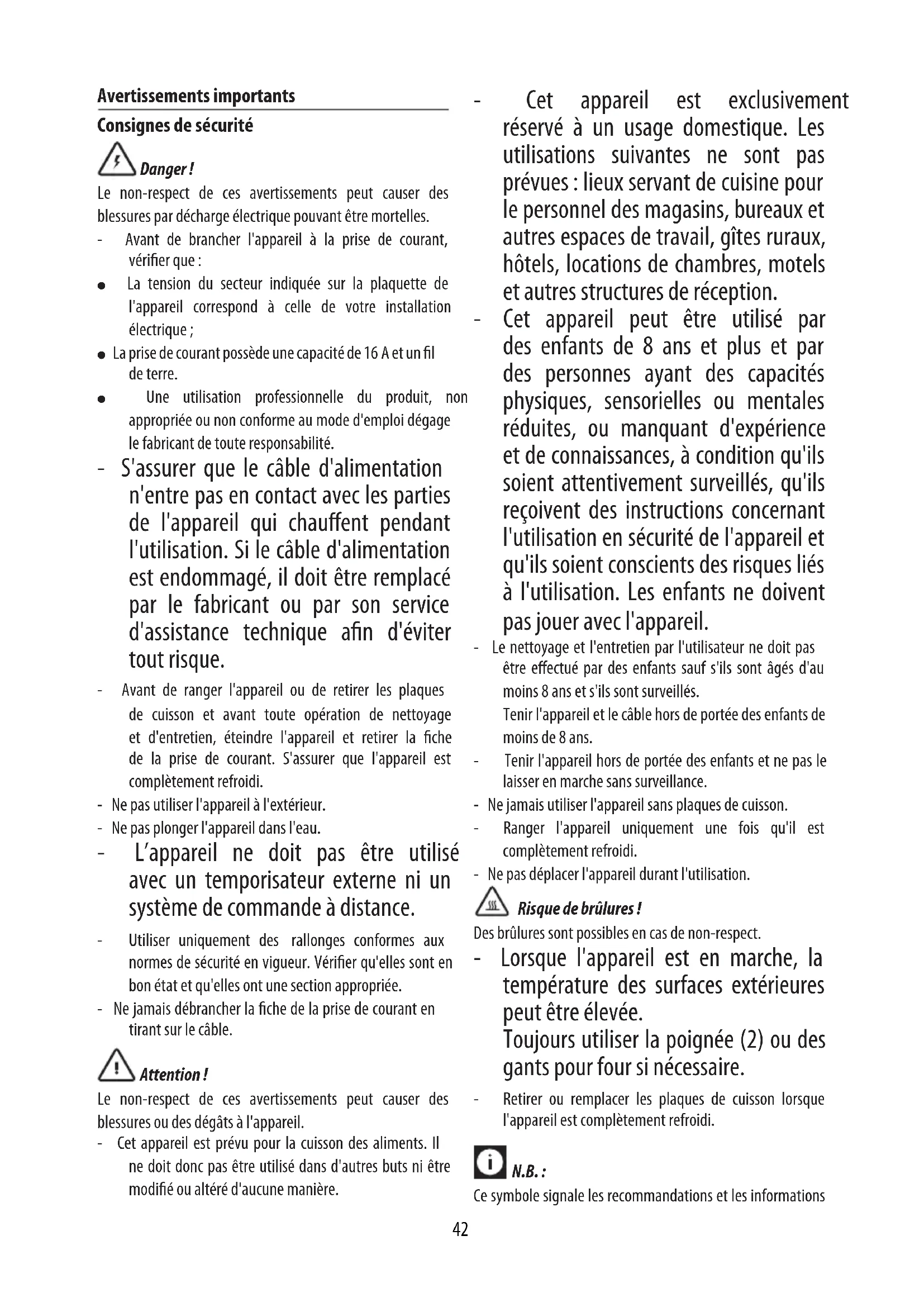 MAKES: 8 - 10 waes PREPARATION: 10min. COOKING TIME: 15 min. INGREDIENTS: - plain our 2 cups (460 g) - salt 1 tsp - baking powder 1 tsp (3 g) - white sugar 3/4 cup (170 g) - eggs 2 - warm milk 1 1/2 cup (345 ml) - butter 80 g - vanilla extract 1 tsp - dark chocolate 140 g - cocoa powder 1/4 cup (60 g) - cinnamon 2 tsp (6 g) PREPARATION: Place the chocolate and butter in a microwave safe bowl and beat on maximum power for 30 seconds. Stir and continue until the chocolate and butter have melted and the mixture is smooth, set aside to cool slightly. Whisk eggs, milk and vanilla together in a large bowl and stir through the cooled chocolate mixture until smooth. Sift the our, sugar, cocoa powder, cinnamon, baking powder and salt together in a large bowl. Add the our mixture to the egg mixture and whisk until mostly smooth with just a few lumps. Preheat the wae iron. When READY is displayed, coat the wae iron with melted butter or non-stick cooking spray and pour on a dosing cup for each wae area, using a spoon if necessary. Spread with a spatula. Cook the waes until golden and crisp (5 min.). Repeat until all the mixture is used. Serve immediately.42 Avertissements importants Consignes de sécurité Danger! Le non-respect de ces avertissements peut causer des blessures par décharge électrique pouvant être mortelles. - Avant de brancher l'appareil à la prise de courant, vérier que: ● La tension du secteur indiquée sur la plaquette de l'appareil correspond à celle de votre installation électrique; ● La prise de courant possède une capacité de 16A et un l de terre. ● Une utilisation professionnelle du produit, non appropriée ou non conforme au mode d'emploi dégage le fabricant de toute responsabilité. - S'assurer que le câble d'alimentation n'entre pas en contact avec les parties de l'appareil qui chauent pendant l'utilisation. Si le câble d'alimentation est endommagé, il doit être remplacé par le fabricant ou par son service d'assistance technique an d'éviter tout risque. - Avant de ranger l'appareil ou de retirer les plaques de cuisson et avant toute opération de nettoyage et d'entretien, éteindre l'appareil et retirer la che de la prise de courant. S'assurer que l'appareil est complètement refroidi. - Ne pas utiliser l'appareil à l'extérieur. - Ne pas plonger l'appareil dans l'eau. - L’appareil ne doit pas être utilisé avec un temporisateur externe ni un système de commande à distance. - Utiliser uniquement des rallonges conformes aux normes de sécurité en vigueur. Vérier qu'elles sont en bon état et qu'elles ont une section appropriée. - Ne jamais débrancher la che de la prise de courant en tirant sur le câble. Attention! Le non-respect de ces avertissements peut causer des blessures ou des dégâts à l'appareil. - Cet appareil est prévu pour la cuisson des aliments. Il ne doit donc pas être utilisé dans d'autres buts ni être modié ou altéré d'aucune manière. - Cet appareil est exclusivement réservé à un usage domestique. Les utilisations suivantes ne sont pas prévues: lieux servant de cuisine pour le personnel des magasins, bureaux et autres espaces de travail, gîtes ruraux, hôtels, locations de chambres, motels et autres structures de réception. - Cet appareil peut être utilisé par des enfants de 8 ans et plus et par des personnes ayant des capacités physiques, sensorielles ou mentales réduites, ou manquant d'expérience et de connaissances, à condition qu'ils soient attentivement surveillés, qu'ils reçoivent des instructions concernant l'utilisation en sécurité de l'appareil et qu'ils soient conscients des risques liés à l'utilisation. Les enfants ne doivent pas jouer avec l'appareil. - Le nettoyage et l'entretien par l'utilisateur ne doit pas être eectué par des enfants sauf s'ils sont âgés d'au moins 8 ans et s'ils sont surveillés. Tenir l'appareil et le câble hors de portée des enfants de moins de 8 ans. - Tenir l'appareil hors de portée des enfants et ne pas le laisser en marche sans surveillance. - Ne jamais utiliser l'appareil sans plaques de cuisson. - Ranger l'appareil uniquement une fois qu'il est complètement refroidi. - Ne pas déplacer l'appareil durant l'utilisation. Risque de brûlures! Des brûlures sont possibles en cas de non-respect. - Lorsque l'appareil est en marche, la température des surfaces extérieures peut être élevée. Toujours utiliser la poignée (2) ou des gants pour four si nécessaire. - Retirer ou remplacer les plaques de cuisson lorsque l'appareil est complètement refroidi. N.B.: Ce symbole signale les recommandations et les informations43 importantes pour l'utilisateur. - Ne pas faire cuire les aliments enveloppés dans des lms en plastique, dans l'aluminium ou dans des sachets en polyéthylène an d'éviter le risque d'incendie. Ce produit est conforme au Règlement (CE) n1935/2004 concernant les matériaux et les objets destinés au contact avec des denrées alimentaires. Mise au rebut de l'appareil Ne pas mettre l'appareil au rebut avec les déchets domestiques, mais le remettre à un centre de collecte sélective ociel. DESCRIPTION
