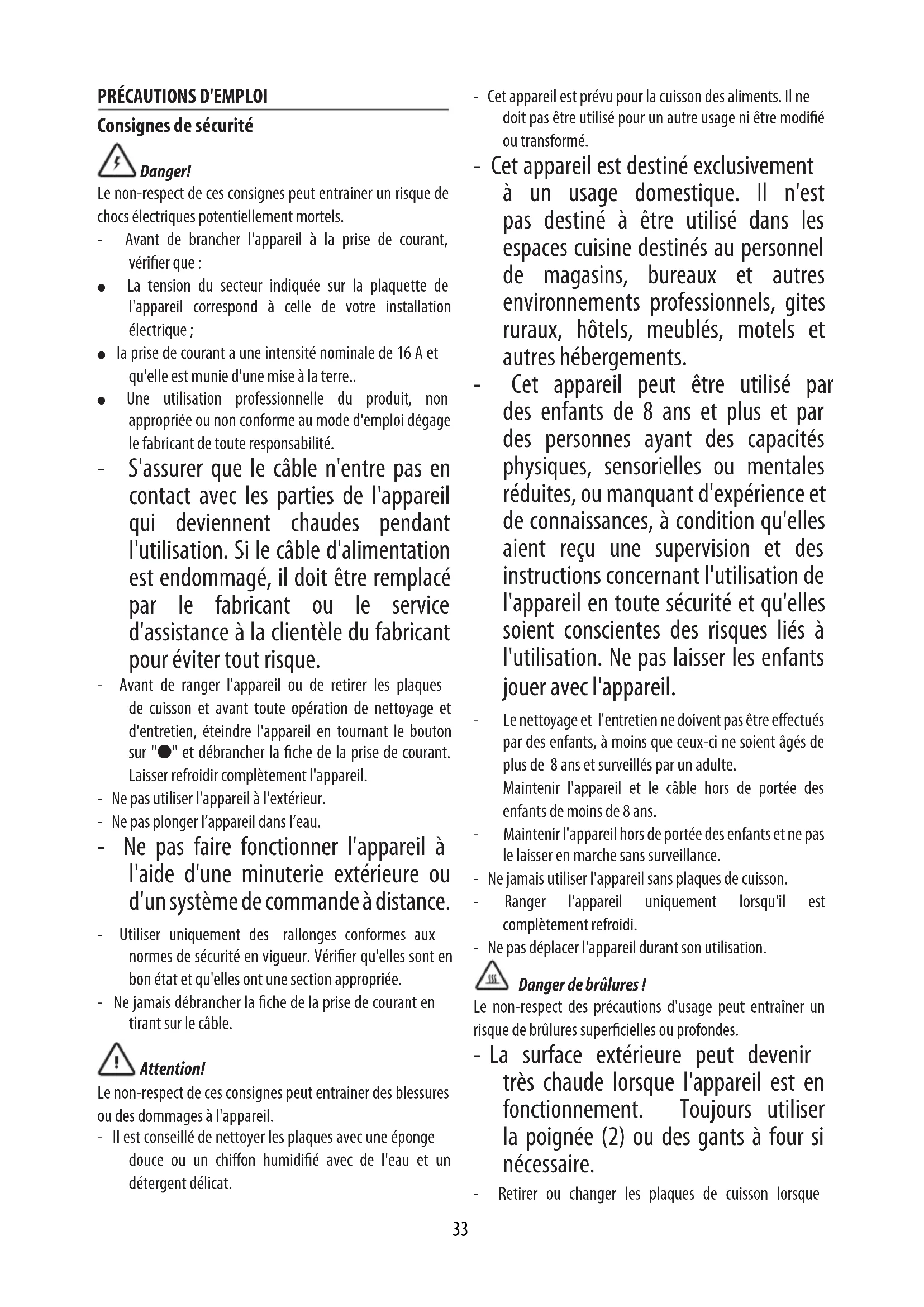 Consignes de sécurité Danger! Le non-respect de ces consignes peut entrainer un risque de chocs électriques potentiellement mortels. - Avant de brancher l'appareil à la prise de courant, vérier que: ● La tension du secteur indiquée sur la plaquette de l'appareil correspond à celle de votre installation électrique; ● la prise de courant a une intensité nominale de 16 A et qu'elle est munie d'une mise à la terre.. ● Une utilisation professionnelle du produit, non appropriée ou non conforme au mode d'emploi dégage le fabricant de toute responsabilité. - S'assurer que le câble n'entre pas en contact avec les parties de l'appareil qui deviennent chaudes pendant l'utilisation. Si le câble d'alimentation est endommagé, il doit être remplacé par le fabricant ou le service d'assistance à la clientèle du fabricant pour éviter tout risque. - Avant de ranger l'appareil ou de retirer les plaques de cuisson et avant toute opération de nettoyage et d'entretien, éteindre l'appareil en tournant le bouton sur "●" et débrancher la che de la prise de courant. Laisser refroidir complètement l'appareil. - Ne pas utiliser l'appareil à l'extérieur. - Ne pas plonger l’appareil dans l’eau. - Ne pas faire fonctionner l'appareil à l'aide d'une minuterie extérieure ou d'un système de commande à distance. - Utiliser uniquement des rallonges conformes aux normes de sécurité en vigueur. Vérier qu'elles sont en bon état et qu'elles ont une section appropriée. - Ne jamais débrancher la che de la prise de courant en tirant sur le câble. Attention! Le non-respect de ces consignes peut entrainer des blessures ou des dommages à l'appareil. - Il est conseillé de nettoyer les plaques avec une éponge douce ou un chion humidié avec de l'eau et un détergent délicat. - Cet appareil est prévu pour la cuisson des aliments. Il ne doit pas être utilisé pour un autre usage ni être modié ou transformé. - Cet appareil est destiné exclusivement à un usage domestique. Il n'est pas destiné à être utilisé dans les espaces cuisine destinés au personnel de magasins, bureaux et autres environnements professionnels, gites ruraux, hôtels, meublés, motels et autres hébergements. - Cet appareil peut être utilisé par des enfants de 8 ans et plus et par des personnes ayant des capacités physiques, sensorielles ou mentales réduites, ou manquant d'expérience et de connaissances, à condition qu'elles aient reçu une supervision et des instructions concernant l'utilisation de l'appareil en toute sécurité et qu'elles soient conscientes des risques liés à l'utilisation. Ne pas laisser les enfants jouer avec l'appareil. - Le nettoyage et l'entretien ne doivent pas être eectués par des enfants, à moins que ceux-ci ne soient âgés de plus de 8 ans et surveillés par un adulte. Maintenir l'appareil et le câble hors de portée des enfants de moins de 8 ans. - Maintenir l'appareil hors de portée des enfants et ne pas le laisser en marche sans surveillance. - Ne jamais utiliser l'appareil sans plaques de cuisson. - Ranger l'appareil uniquement lorsqu'il est complètement refroidi. - Ne pas déplacer l'appareil durant son utilisation. Danger de brûlures! Le non-respect des précautions d'usage peut entraîner un risque de brûlures supercielles ou profondes. - La surface extérieure peut devenir très chaude lorsque l'appareil est en fonctionnement. Toujours utiliser la poignée (2) ou des gants à four si nécessaire. - Retirer ou changer les plaques de cuisson lorsque34 l'appareil est complètement refroidi . N.B.: Ce symbole signale des recommandations et des informations importantes pour l'utilisateur. - Ne pas faire cuire des aliments enveloppés dans des lms en plastique, dans des feuilles d'aluminium ou dans des sachets en polyéthylène an d'éviter tout risque d'incendie. Cet appareil est conforme au règlement CEE 1935/2004 concernant les matériaux et objets destinés à entrer en contact avec des denrées alimentaires. Élimination de l'appareil Ne pas éliminer l'appareil avec les déchets ménagers, mais le déposer dans un centre de collecte agréé. DESCRIPTION