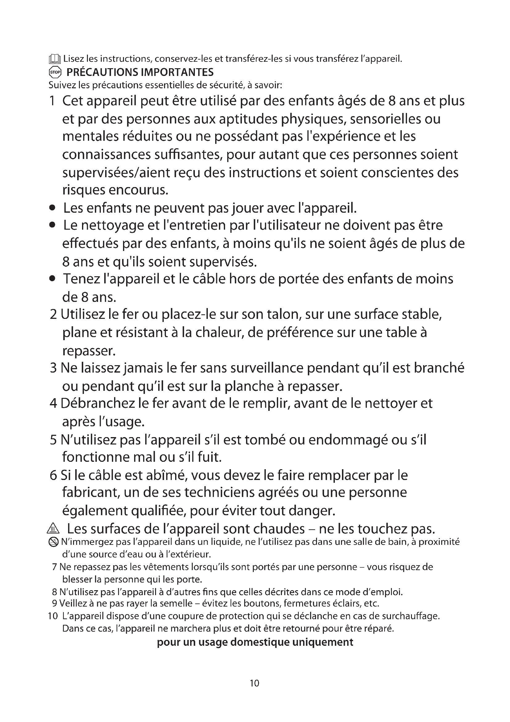 - Tenez l'appareil et le câble hors de portée des enfants de moins de 8 ans. 2 Utilisez le fer ou placez-le sur son talon, sur une surface stable, plane et résistant à la chaleur, de préférence sur une table à repasser. 3 Ne laissez jamais le fer sans surveillance pendant qu’il est branché ou pendant qu’il est sur la planche à repasser. 4 Débranchez le fer avant de le remplir, avant de le nettoyer et après l’usage. 5 N’utilisez pas l’appareil s’il est tombé ou endommagé ou s’il fonctionne mal ou s’il fuit. 6 Si le câble est abîmé, vous devez le faire remplacer par le fabricant, un de ses techniciens agréés ou une personne également qualifiée, pour éviter tout danger. h Les surfaces de l’appareil sont chaudes – ne les touchez pas. L N’immergez pas l’appareil dans un liquide, ne l’utilisez pas dans une salle de bain, à proximité d’une source d’eau ou à l’extérieur. 7 Ne repassez pas les vêtements lorsqu’ils sont portés par une personne – vous risquez de blesser la personne qui les porte. 8 N’utilisez pas l’appareil à d’autres fins que celles décrites dans ce mode d’emploi. 9 Veillez à ne pas rayer la semelle – évitez les boutons, fermetures éclairs, etc. 10 L’appareil dispose d’une coupure de protection qui se déclanche en cas de surchauffage. Dans ce cas, l’appareil ne marchera plus et doit être retourné pour être réparé. pour un usage domestique uniquement11