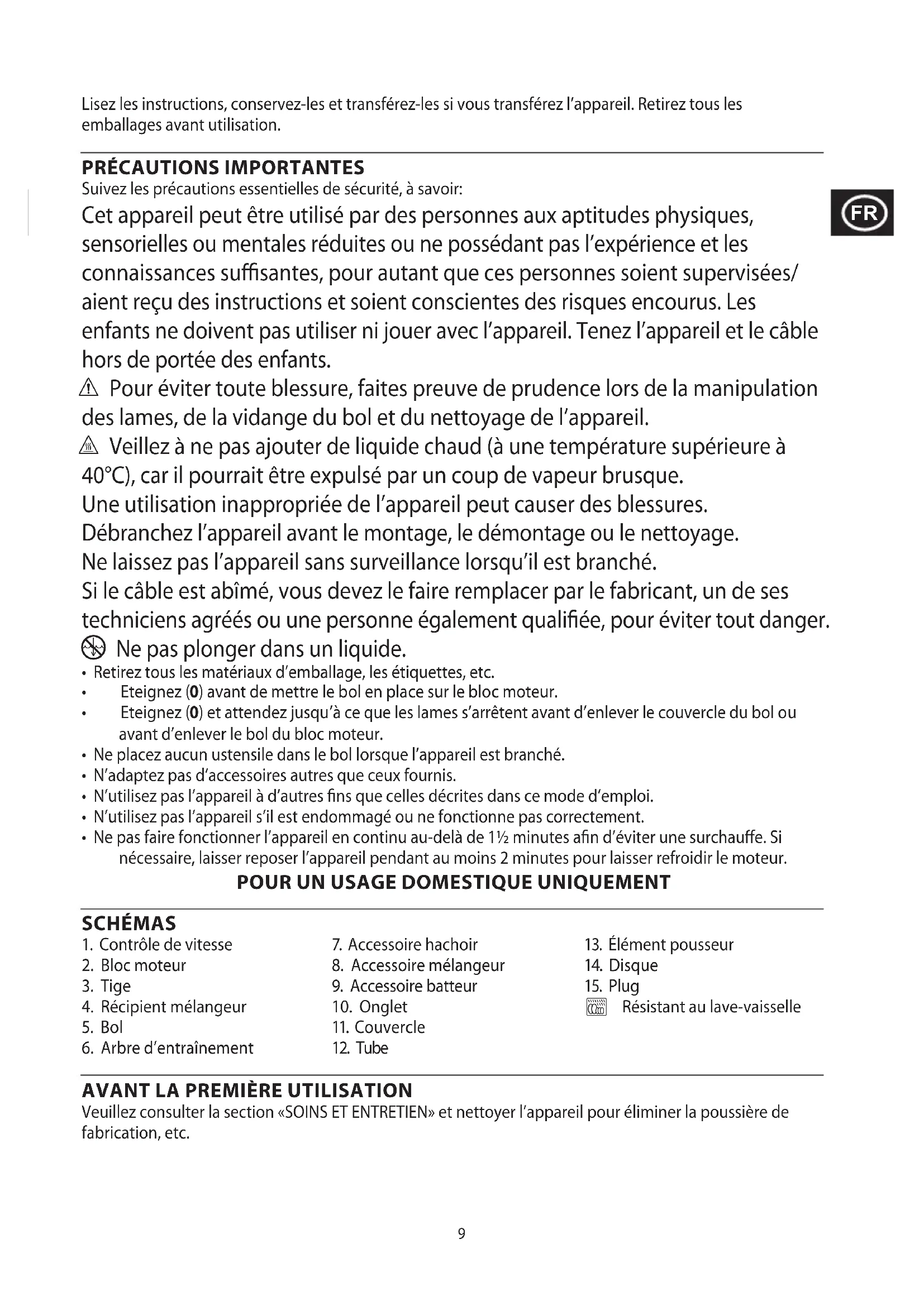 Suivez les précautions essentielles de sécurité, à savoir: Cet appareil peut être utilisé par des personnes aux aptitudes physiques, sensorielles ou mentales réduites ou ne possédant pas l’expérience et les connaissances suffisantes, pour autant que ces personnes soient supervisées/ aient reçu des instructions et soient conscientes des risques encourus. Les enfants ne doivent pas utiliser ni jouer avec l’appareil. Tenez l’appareil et le câble hors de portée des enfants. c Pour éviter toute blessure, faites preuve de prudence lors de la manipulation des lames, de la vidange du bol et du nettoyage de l’appareil. h Veillez à ne pas ajouter de liquide chaud (à une température supérieure à 40°C), car il pourrait être expulsé par un coup de vapeur brusque. Une utilisation inappropriée de l’appareil peut causer des blessures. Débranchez l’appareil avant le montage, le démontage ou le nettoyage. Ne laissez pas l’appareil sans surveillance lorsqu’il est branché. Si le câble est abîmé, vous devez le faire remplacer par le fabricant, un de ses techniciens agréés ou une personne également qualifiée, pour éviter tout danger.