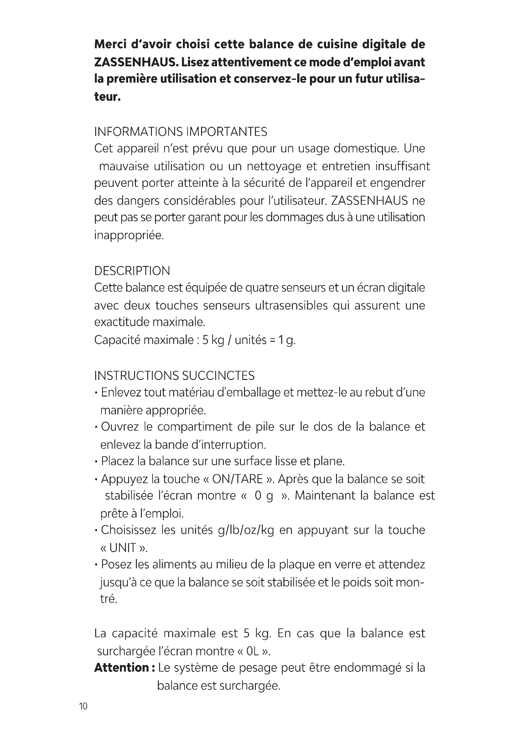 BALANCE BA Digital Waage "Balance" 073xxx.qxp_Layout 1 19.10.22 12:08 Seite 910 Merci d’avoir choisi cette balance de cuisine digitale de ZASSENHAUS. Lisez attentivement ce mode d’emploi avant la première utilisation et conservez-le pour un futur utilisa- teur. INFORMATIONS IMPORTANTES Cet appareil n’est prévu que pour un usage domestique. Une mauvaise utilisation ou un nettoyage et entretien insuffisant peuvent porter atteinte à la sécurité de l’appareil et engendrer des dangers considérables pour l’utilisateur. ZASSENHAUS ne peut pas se porter garant pour les dommages dus à une utilisation inappropriée. DESCRIPTION Cette balance est équipée de quatre senseurs et un écran digitale avec deux touches senseurs ultrasensibles qui assurent une exactitude maximale. Capacité maximale: 5 kg / unités = 1 g. INSTRUCTIONS SUCCINCTES
