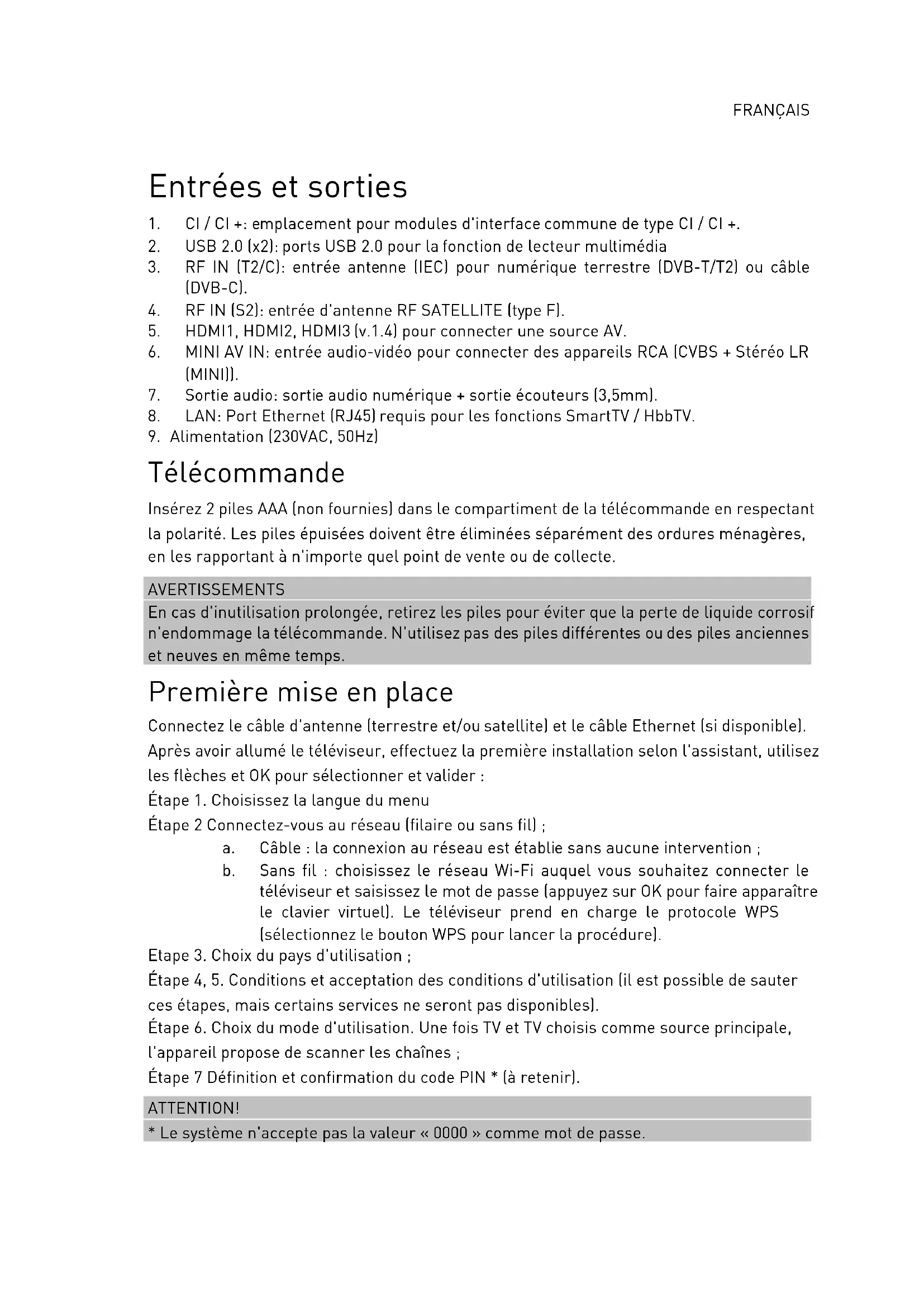 Télécommande Insérez 2 piles AAA (non fournies) dans le compartiment de la télécommande en respectant la polarité. Les piles épuisées doivent être éliminées séparément des ordures ménagères, en les rapportant à n'importe quel point de vente ou de collecte. AVERTISSEMENTS En cas d'inutilisation prolongée, retirez les piles pour éviter que la perte de liquide corrosif n'endommage la télécommande. N'utilisez pas des piles différentes ou des piles anciennes et neuves en même temps. Première mise en place Connectez le câble d'antenne (terrestre et/ou satellite) et le câble Ethernet (si disponible). Après avoir allumé le téléviseur, effectuez la première installation selon l'assistant, utilisez les flèches et OK pour sélectionner et valider : Étape 1. Choisissez la langue du menu Étape 2 Connectez-vous au réseau (filaire ou sans fil) ; a. Câble : la connexion au réseau est établie sans aucune intervention ; b. Sans fil : choisissez le réseau Wi-Fi auquel vous souhaitez connecter le téléviseur et saisissez le mot de passe (appuyez sur OK pour faire apparaître le clavier virtuel). Le téléviseur prend en charge le protocole WPS (sélectionnez le bouton WPS pour lancer la procédure). Etape 3. Choix du pays d'utilisation ; Étape 4, 5. Conditions et acceptation des conditions d'utilisation (il est possible de sauter ces étapes, mais certains services ne seront pas disponibles). Étape 6. Choix du mode d'utilisation. Une fois TV et TV choisis comme source principale, l'appareil propose de scanner les chaînes ; Étape 7 Définition et confirmation du code PIN * (à retenir). ATTENTION!