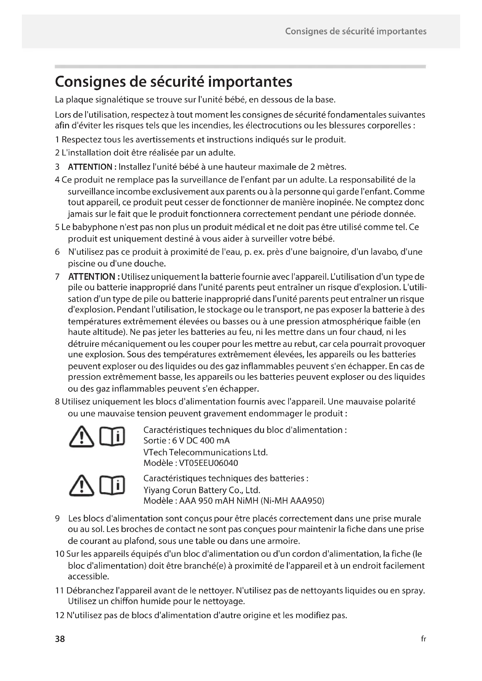 ATTENTION : Installez l'unité bébé à une hauteur maximale de 2 mètres. 4 Ce produit ne remplace pas la surveillance de l'enfant par un adulte. La responsabilité de la surveillance incombe exclusivement aux parents ou à la personne qui garde l'enfant. Comme tout appareil, ce produit peut cesser de fonctionner de manière inopinée. Ne comptez donc jamais sur le fait que le produit fonctionnera correctement pendant une période donnée. 5 Le babyphone n'est pas non plus un produit médical et ne doit pas être utilisé comme tel. Ce produit est uniquement destiné à vous aider à surveiller votre bébé. 6 N'utilisez pas ce produit à proximité de l'eau, p. ex. près d'une baignoire, d'un lavabo, d'une piscine ou d'une douche. 7 ATTENTION : Utilisez uniquement la batterie fournie avec l'appareil. L'utilisation d'un type de pile ou batterie inapproprié dans l'unité parents peut entraîner un risque d'explosion. L'utili- sation d'un type de pile ou batterie inapproprié dans l'unité parents peut entraîner un risque d'explosion. Pendant l'utilisation, le stockage ou le transport, ne pas exposer la batterie à des températures extrêmement élevées ou basses ou à une pression atmosphérique faible (en haute altitude). Ne pas jeter les batteries au feu, ni les mettre dans un four chaud, ni les détruire mécaniquement ou les couper pour les mettre au rebut, car cela pourrait provoquer une explosion. Sous des températures extrêmement élevées, les appareils ou les batteries peuvent exploser ou des liquides ou des gaz inflammables peuvent s'en échapper. En cas de pression extrêmement basse, les appareils ou les batteries peuvent exploser ou des liquides ou des gaz inflammables peuvent s'en échapper. 8 Utilisez uniquement les blocs d'alimentation fournis avec l'appareil. Une mauvaise polarité ou une mauvaise tension peuvent gravement endommager le produit : 9 Les blocs d'alimentation sont conçus pour être placés correctement dans une prise murale ou au sol. Les broches de contact ne sont pas conçues pour maintenir la fiche dans une prise de courant au plafond, sous une table ou dans une armoire. 10 Sur les appareils équipés d'un bloc d'alimentation ou d'un cordon d'alimentation, la fiche (le bloc d'alimentation) doit être branché(e) à proximité de l'appareil et à un endroit facilement accessible. 11 Débranchez l'appareil avant de le nettoyer. N'utilisez pas de nettoyants liquides ou en spray. Utilisez un chiffon humide pour le nettoyage. 12 N'utilisez pas de blocs d'alimentation d'autre origine et les modifiez pas. Caractéristiques techniques du bloc d'alimentation : Sortie : 6 V DC 400 mA VTech Telecommunications Ltd. Modèle : VT05EEU06040 Caractéristiques techniques des batteries : Yiyang Corun Battery Co., Ltd. Modèle : AAA 950 mAH NiMH (Ni-MH AAA950)Template Module, Version 2.2, 15.11.2022 / Template Basiseinstellungen - 29.11.2022 Consignes de sécurité importantes Gigaset BABY100 Audio / ALL DE de / A31008-N1225-B101-1-43 / BABY100_fr.fm / 5/22/25