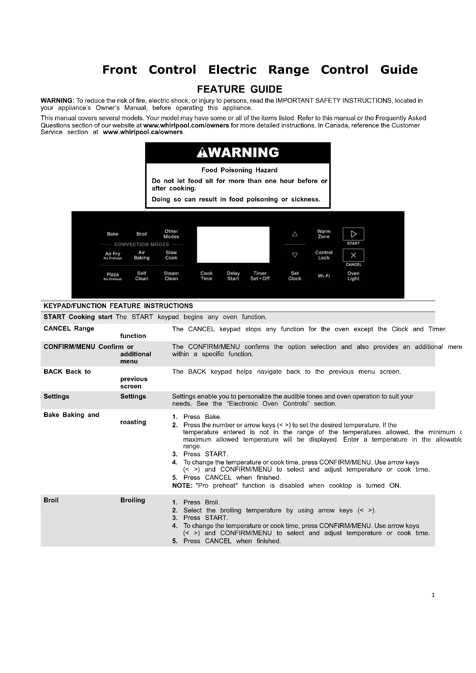 AVERTISSEMENT : Pour réduire le risque d’incendie, de décharge électrique ou de blessures, lire les INSTRUCTIONS IMPORTANTES DE SÉCURITÉ du guide d’utilisation de votre appareil avant de faire fonctionner cet appareil. Le présent manuel couvre plusieurs modèles. Votre modèle peut comporter toutes les caractéristiques énumérées ou seulement certaines d’entre elles. Se reporter à ce manuel ou à la section Foire aux questions de notre site Web au www.whirlpool.com/owners pour des instructions plus détaillées. Au Canada, consulter la section service à la clientèle au www.whirlpool.ca/proprietaire. AVERTISSEMENT Risque d’empoisonnement alimentaire Ne pas laisser des aliments reposer plus d’une heure avant ou après la cuisson. Le non-respect de cette instruction peut causer un empoisonnement alimentaire ou une maladie. TOUCHE/FONCTION CARACTÉRIS- TIQUE INSTRUCTIONS