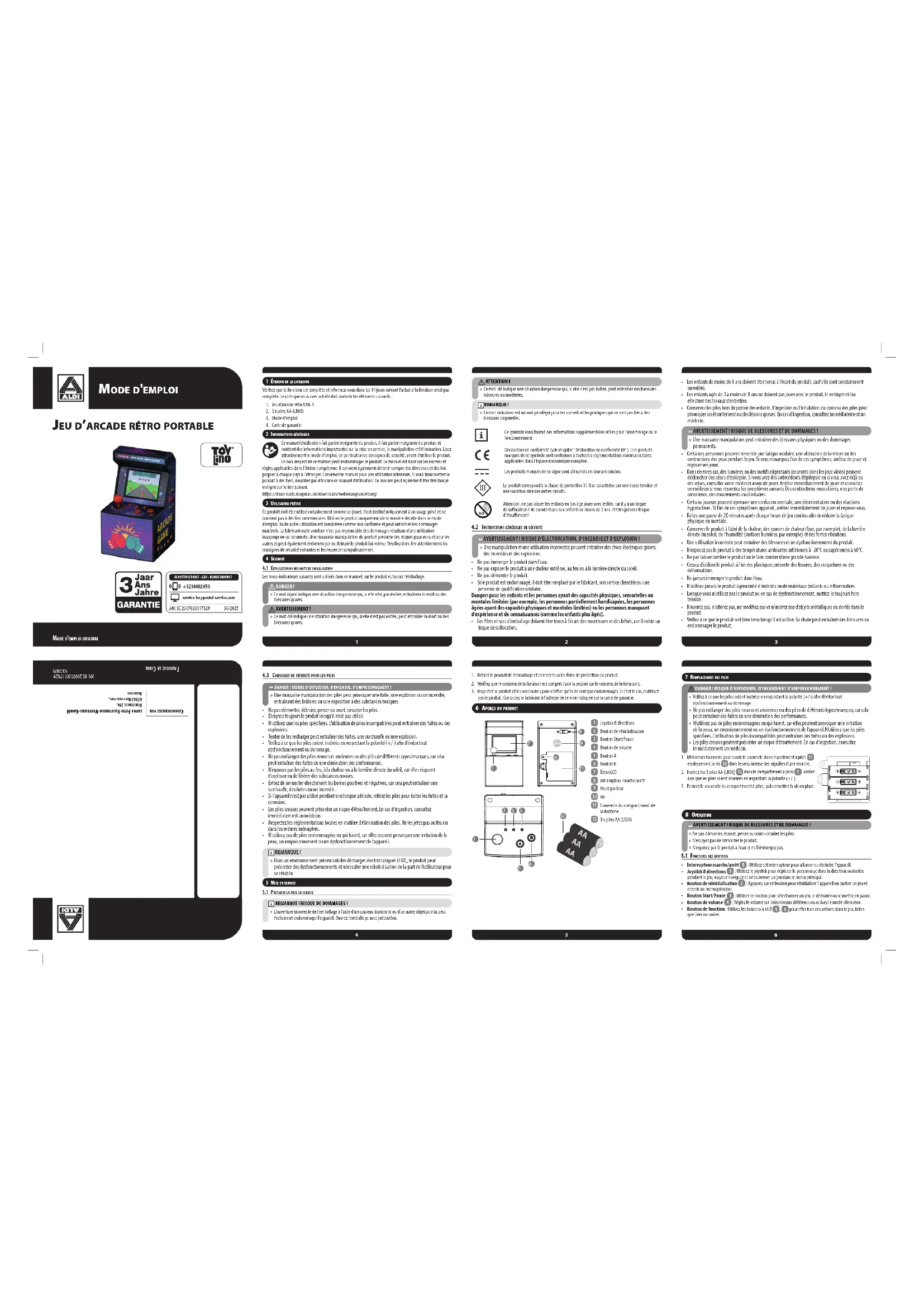 SpécificationS techniqueS Modèle : RAG-1 Alimentation électrique : 3 x piles AA (LR06) Tension des piles : 3 x 1,5 V CC Autonomie : env. 4 heures par jeu de piles Écran : Écran LCD couleur de 2,5" Résolution de l’écran : 320 x 240 pixels Processeur : Chipset 8 bits Nombre de jeux : 240 Puissance de sortie du haut- parleur : 8 Ohms, 0,25 W Commandes : Joystick 8 directions, boutons d’action, boutons de fonction Température de fonctionnement : 0 °C à 40 °C (32 °F à 104 °F) Dimensions (P x l x H) : env. 90 x 85 x 148 mm Poids : env. 245 g (piles incluses) Convient pour : À partir de 8 ans Classe de protection : Classe de protection III REMARQUE ! » La conception et les spécications techniques peuvent être modiées sans préavis. 13 D éclaration De conformité Nous, supra Foto-Elektronik-Vertriebs-GmbH, sise à l’adresse suivante : Denisstraße 28a, 67663 Kaiserslautern, Allemagne, déclarons sous notre seule responsabilité que le produit satisfait aux exigences essentielles des directives européennes mentionnées. La déclaration de conformité de l’UE peut être demandée à l’adresse indiquée au dos du manuel.