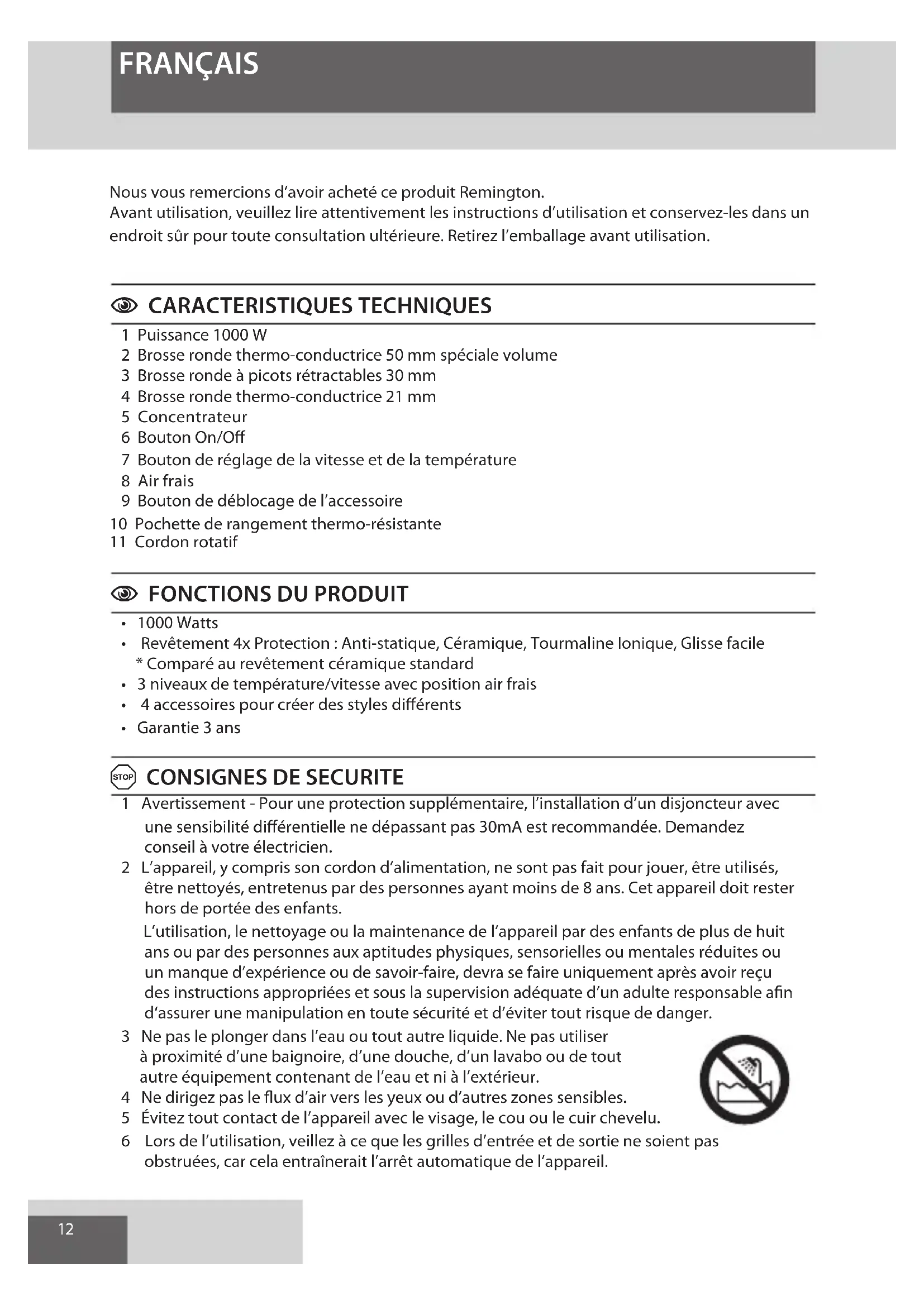 Ceproduitaétécontrôléetneprésenteaucundéfaut. Nousgarantissonsceproduitcontretoutdéfautdefabricationoumatérielpendantladurée degarantie,àcompterdeladated’achatinitiale. Siceproduitdevenaitdéfectueuxdurantlapériodedegarantie,nousnousengagerionsàle réparerouleremplacer,enpartieouentotalité,surprésentationd’unepreuved’achat. Celan’impliqueaucuneprolongationdelapériodedegarantie. Sil’appareilestsousgarantie,contactezleserviceconsommateurs. Cette garantie est oerte en plus de vos droits statutaires normaux. Lagaranties’appliqueàtouslespaysdanslesquelsnotreproduitaétévenduparun revendeuragréé. Cettegarantien’inclutpaslesdégâtscausésàl’appareilsuiteàunaccident,unemauvaise utilisation, une utilisation abusive, une modication du produit ou une utilisation ne respectantpaslesconsignestechniqueset/oudesécurité. Cettegarantienes’appliquepassileproduitaétédémontéouréparéparunepersonnenon autoriséeparRemington. Sivousappelezleserviceconsommateurs,veuillezavoirenvotrepossessionlenumérodu modèle;nousneseronsenmesuredevousaidersanscelui-ci. Lenumérodumodèleestsituésurl’appareil. FRANÇAIS15 ESPAÑOL GraciasporcomprarnuestronuevoproductoRemington®. Antes de usarlo, lea detenidamente las instrucciones y guárdelas en un lugar seguro. Quite todoelembalajeantesdeusarelproducto.