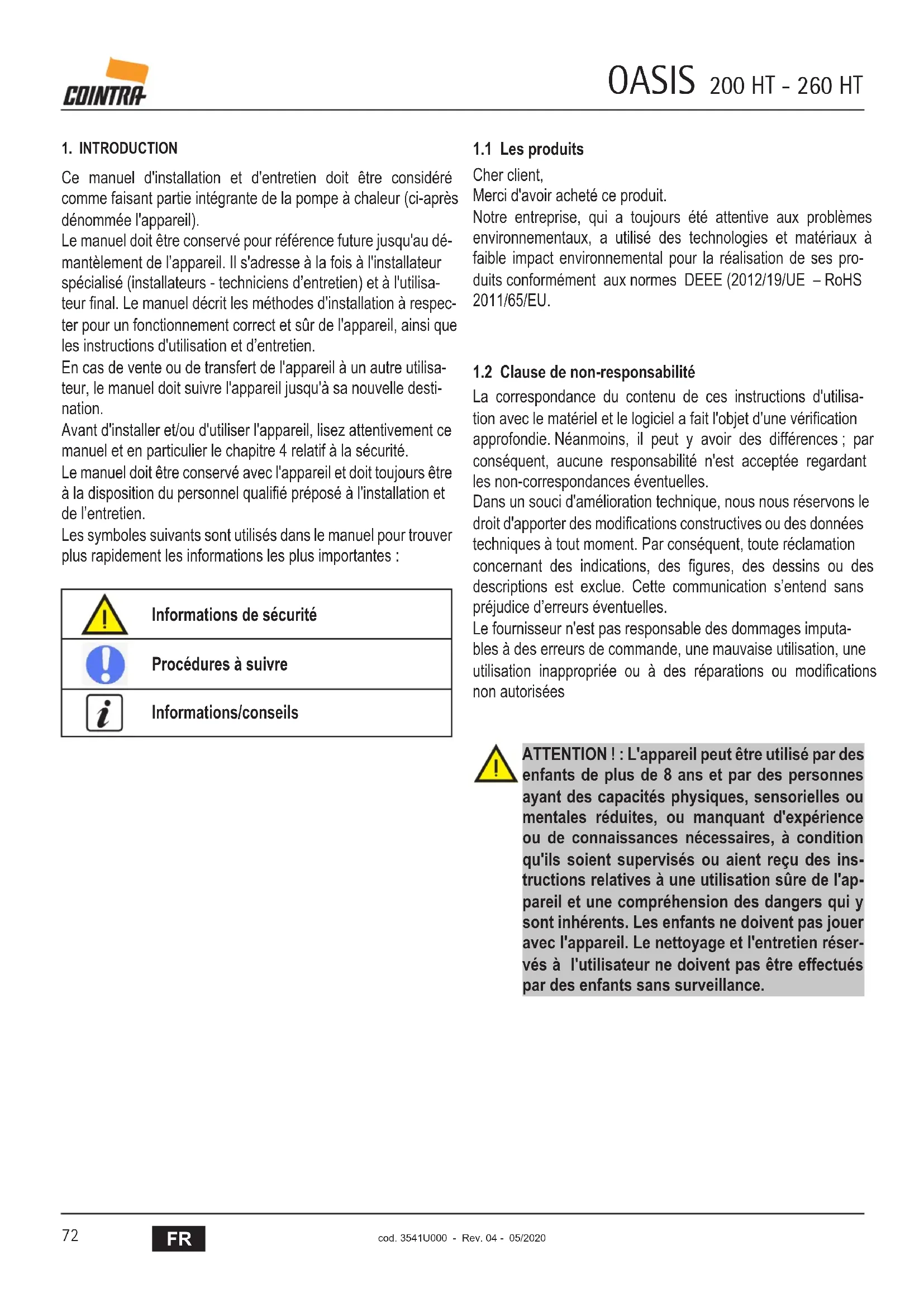 1. INTRODUCTIONCe manuel d'installation et d'entretien doit être considéré comme faisant partie intégrante de la pompe à chaleur (ci-après dénommée l'appareil).Le manuel doit être conservé pour référence future jusqu'au dé-mantèlement de l’appareil. Il s'adresse à la fois à l'installateur spécialisé (installateurs - techniciens d’entretien) et à l'utilisa-teur final. Le manuel décrit les méthodes d'installation à respec-ter pour un fonctionnement correct et sûr de l'appareil, ainsi que les instructions d'utilisation et d’entretien.En cas de vente ou de transfert de l'appareil à un autre utilisa-teur, le manuel doit suivre l'appareil jusqu'à sa nouvelle desti-nation.Avant d'installer et/ou d'utiliser l'appareil, lisez attentivement ce manuel et en particulier le chapitre 4 relatif à la sécurité. Le manuel doit être conservé avec l'appareil et doit toujours être à la disposition du personnel qualifié préposé à l'installation et de l’entretien. Les symboles suivants sont utilisés dans le manuel pour trouver plus rapidement les informations les plus importantes : Informations de sécurité Procédures à suivre Informations/conseils 1.1 Les produits Cher client, Merci d'avoir acheté ce produit.Notre entreprise, qui a toujours été attentive aux problèmes environnementaux, a utilisé des technologies et matériaux à faible impact environnemental pour la réalisation de ses pro-duits conformément aux normes DEEE (2012/19/UE – RoHS 2011/65/EU.1.2 Clause de non-responsabilitéLa correspondance du contenu de ces instructions d'utilisa-tion avec le matériel et le logiciel a fait l'objet d'une vérification approfondie. Néanmoins, il peut y avoir des différences ; par conséquent, aucune responsabilité n'est acceptée regardant les non-correspondances éventuelles.Dans un souci d'amélioration technique, nous nous réservons le droit d'apporter des modifications constructives ou des données techniques à tout moment. Par conséquent, toute réclamation concernant des indications, des figures, des dessins ou des descriptions est exclue. Cette communication s’entend sans préjudice d’erreurs éventuelles.Le fournisseur n'est pas responsable des dommages imputa-bles à des erreurs de commande, une mauvaise utilisation, une utilisation inappropriée ou à des réparations ou modifications non autorisées ATTENTION ! : L'appareil peut être utilisé par des enfants de plus de 8 ans et par des personnes ayant des capacités physiques, sensorielles ou mentales réduites, ou manquant d'expérience ou de connaissances nécessaires, à condition qu'ils soient supervisés ou aient reçu des ins-tructions relatives à une utilisation sûre de l'ap-pareil et une compréhension des dangers qui y sont inhérents. Les enfants ne doivent pas jouer avec l'appareil. Le nettoyage et l'entretien réser-vés à l'utilisateur ne doivent pas être effectués par des enfants sans surveillance.OASIS 200 HT - 260 HT