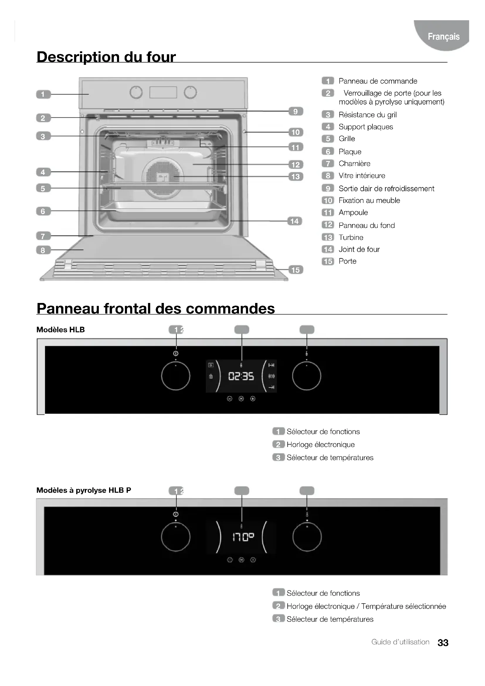 Modèles à pyrolyse HLB P34 Guide d’utilisation Symboles du sélecteur de fonctions Modèle HLB 830 Modèle HLB 840, HLB 850 Modèle HLB 830 P Modèle HLB 840 P Fonctions du four INFORMATION Consultez le guide de cuisson fourni avec votre four pour lire la description des usages de chacune des fonctions.