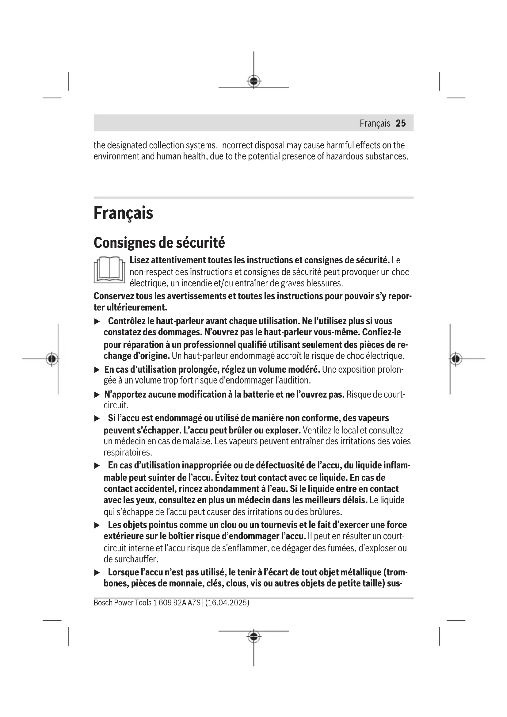 IP54 Températures ambiantes recommandées pour la charge °C 0…+35 Températures ambiantes autorisées pour l’utilisation °C −20…+40 Températures ambiantes autorisées pour le stockage °C –20…+50 Batteries recommandées (2,0−12,0Ah) GBA18V… ProCORE18V… EXPERT18V… EXBA18V… CORE18V… Chargeurs recommandés GAL18V… GAL36V… GAL12V/18… Bosch Power Tools 1 609 92A A7S | (16.04.2025)28 | Français Enceinte Bluetooth®