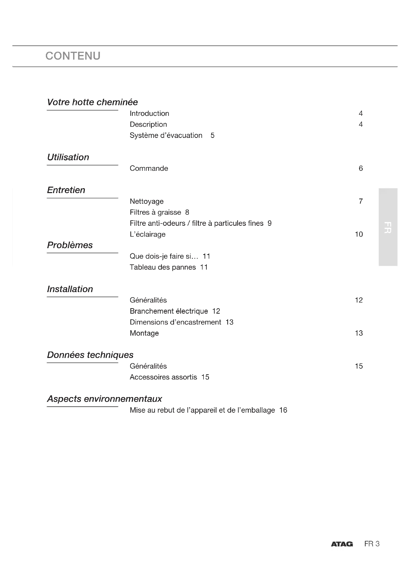 CONTENU Votre hotte cheminée Introduction 4 Description 4 Système d’évacuation 5 Utilisation Commande 6 Entretien Nettoyage 7 Filtres à graisse 8 Filtre anti-odeurs / filtre à particules fines 9 L’éclairage 10 Problèmes Que dois-je faire si… 11 Tableau des pannes 11 Installation Généralités 12 Branchement électrique 12 Dimensions d’encastrement 13 Montage 13 Données techniques Généralités 15 Accessoires assortis 15 Aspects environnementaux Mise au rebut de l’appareil et de l’emballage 16FR 4 Introduction Nous vous félicitons d’avoir choisi cet appareil. La souplesse et la simplicité de l’utilisation sont les principes qui ont guidé son développement. Ce manuel vous explique comment utiliser cet appareil de manière optimale. En plus des informations relatives au fonctionnement de l’appareil, vous y trouverez des renseignements de base susceptibles d’en faciliter l’utilisation. Veuillez lire attentivement les consignes de sécurité fournies séparément avant toute utilisation de l’appareil. Lisez attentivement cette notice d’utilisation avant d’utiliser l’appareil et rangez-la en lieu sûr pour la consulter ultérieurement. Description WO602