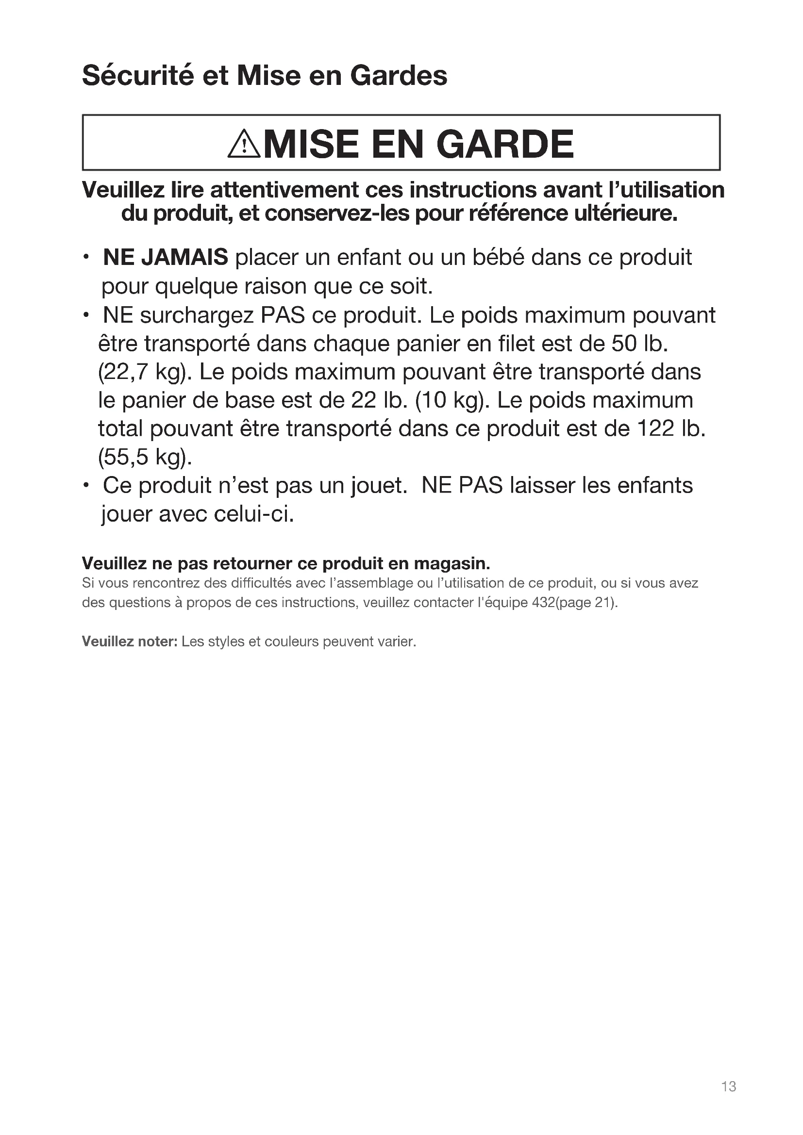 - Ce produit n’est pas un jouet. NE PAS laisser les enfants jouer avec celui-ci. Veuillez ne pas retourner ce produit en magasin. Si vous rencontrez des dicultés avec l’assemblage ou l’utilisation de ce produit, ou si vous avez des questions à propos de ces instructions, veuillez contacter l'équipe 432(page 21).Veuillez noter: Les styles et couleurs peuvent varier.