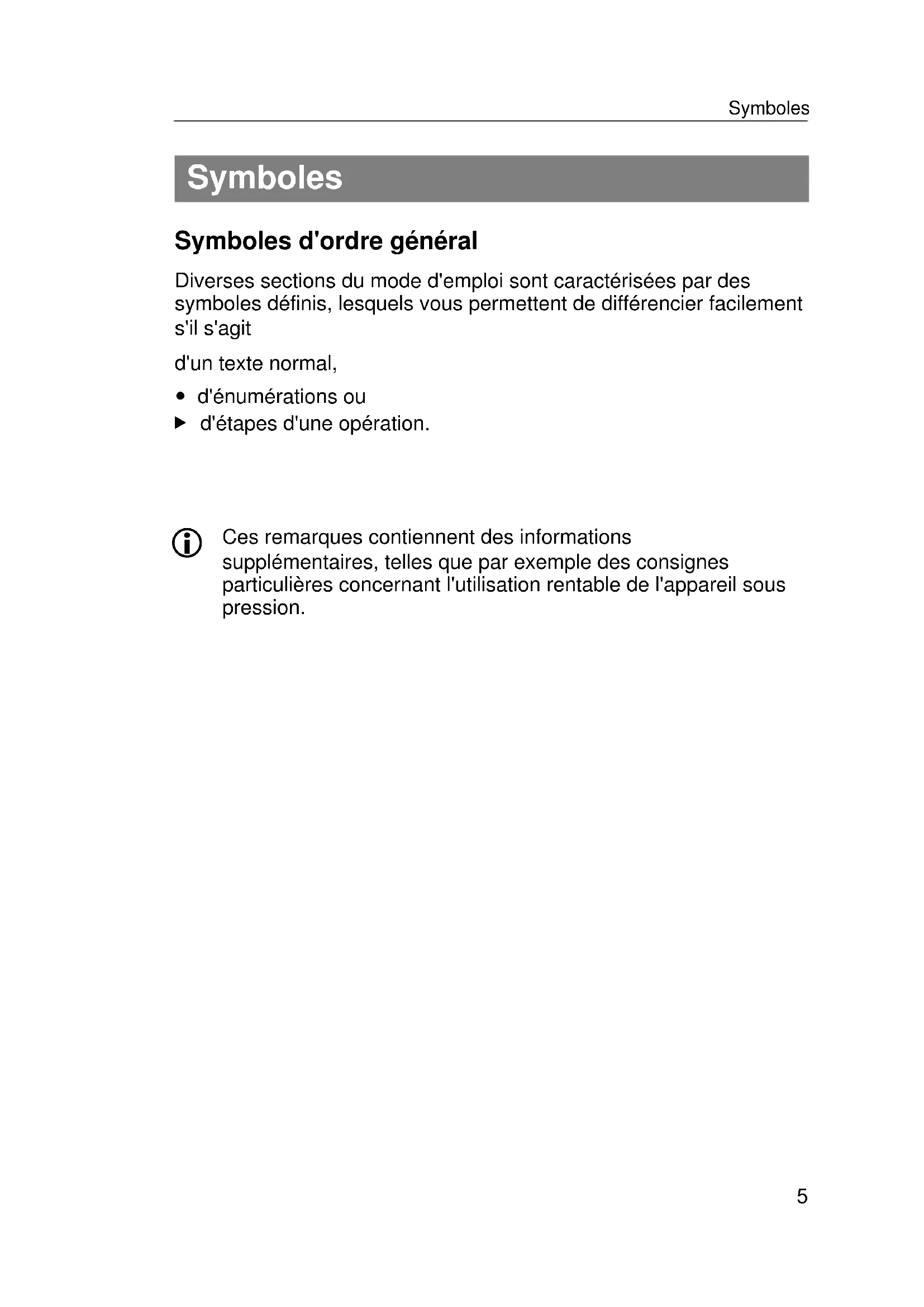 Diverses sections du mode d'emploi sont caractérisées par des symboles définis, lesquels vous permettent de différencier facilement s'il s'agit