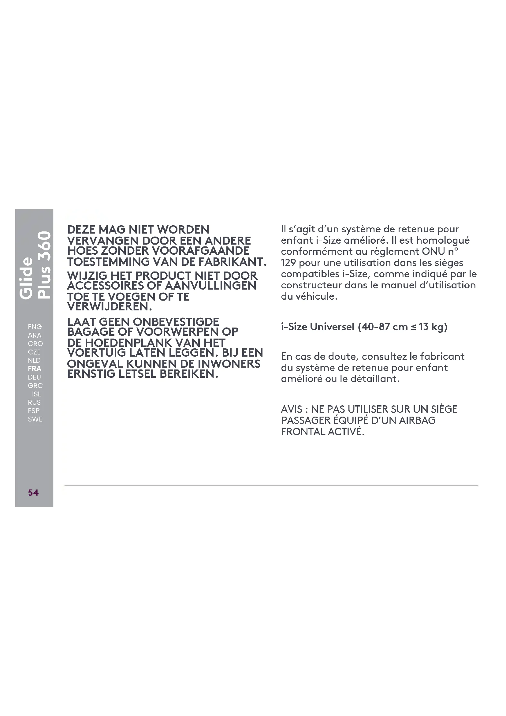 ERNSTIG LETSEL BEREIKEN. Il s’agit d’un système de retenue pour enfant i-Size amélioré. Il est homologué conformément au règlement ONU n° 129 pour une utilisation dans les sièges compatibles i-Size, comme indiqué par le constructeur dans le manuel d’utilisation du véhicule. i-Size Universel (40-87 cm ≤ 13 kg) En cas de doute, consultez le fabricant du système de retenue pour enfant amélioré ou le détaillant. AVIS : NE PAS UTILISER SUR UN SIÈGE
