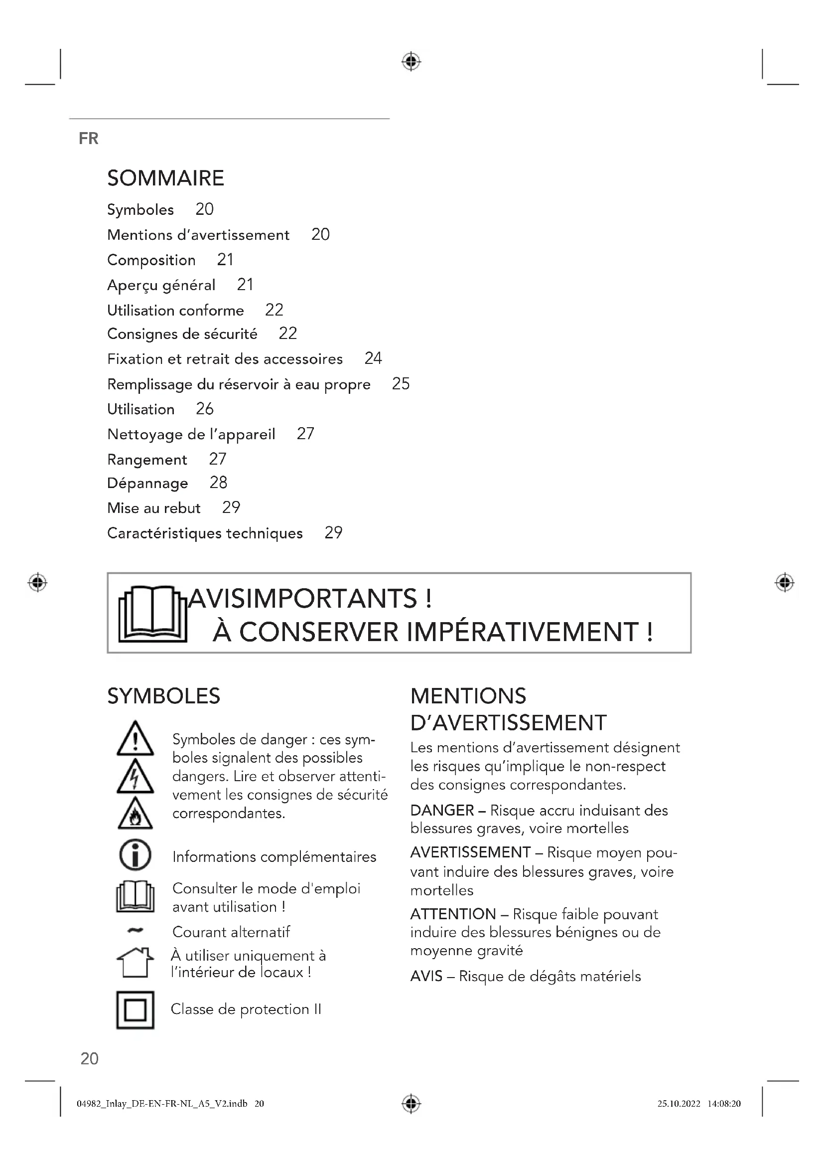SOMMAIRE Symboles 20 Mentions d’avertissement 20 Composition 21 Aperçu général 21 Utilisation conforme 22 Consignes de sécurité 22 Fixation et retrait des accessoires 24 Remplissage du réservoir à eau propre 25 Utilisation 26 Nettoyage de l’appareil 27 Rangement 27 Dépannage 28 Mise au rebut 29 Caractéristiques techniques 29 SYMBOLES Symboles de danger: ces sym- boles signalent des possibles dangers. Lire et observer attenti- vement les consignes de sécurité correspondantes. Informations complémentaires Consulter le mode d'emploi avant utilisation! Courant alternatif À utiliser uniquement à l’intérieur de locaux! Classe de protection II MENTIONS D’AVERTISSEMENT Les mentions d’avertissement désignent les risques qu’implique le non-respect des consignes correspondantes. DANGER– Risque accru induisant des blessures graves, voire mortelles AVERTISSEMENT– Risque moyen pou- vant induire des blessures graves, voire mortelles ATTENTION– Risque faible pouvant induire des blessures bénignes ou de moyenne gravité AVIS– Risque de dégâts matériels AVIS IMPORTANTS! À CONSERVER IMPÉRATIVEMENT! 04982_Inlay_DE-EN-FR-NL_A5_V2.indb 2004982_Inlay_DE-EN-FR-NL_A5_V2.indb 20 25.10.2022 14:08:2025.10.2022 14:08:20FR