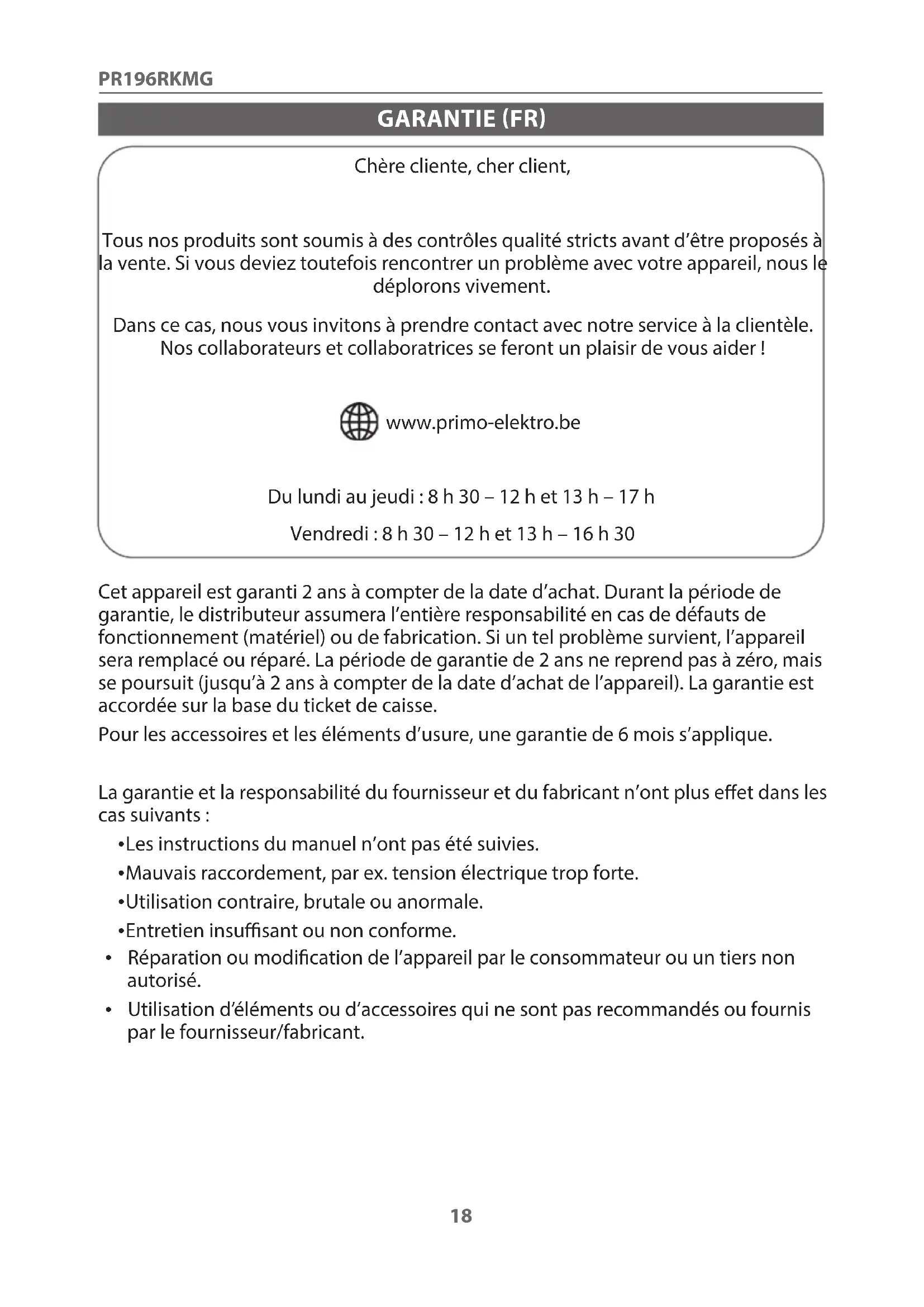 GARANTIE (FR) Chère cliente, cher client, Tous nos produits sont soumis à des contrôles qualité stricts avant d’être proposés à la vente. Si vous deviez toutefois rencontrer un problème avec votre appareil, nous le déplorons vivement. Dans ce cas, nous vous invitons à prendre contact avec notre service à la clientèle. Nos collaborateurs et collaboratrices se feront un plaisir de vous aider ! www.primo-elektro.be Du lundi au jeudi : 8 h 30 – 12 h et 13 h – 17 h Vendredi : 8 h 30 – 12 h et 13 h – 16 h 30 Cet appareil est garanti 2 ans à compter de la date d’achat. Durant la période de garantie, le distributeur assumera l’entière responsabilité en cas de défauts de fonctionnement (matériel) ou de fabrication. Si un tel problème survient, l’appareil sera remplacé ou réparé. La période de garantie de 2 ans ne reprend pas à zéro, mais se poursuit (jusqu’à 2 ans à compter de la date d’achat de l’appareil). La garantie est accordée sur la base du ticket de caisse. Pour les accessoires et les éléments d’usure, une garantie de 6 mois s’applique. La garantie et la responsabilité du fournisseur et du fabricant n’ont plus eet dans les cas suivants :