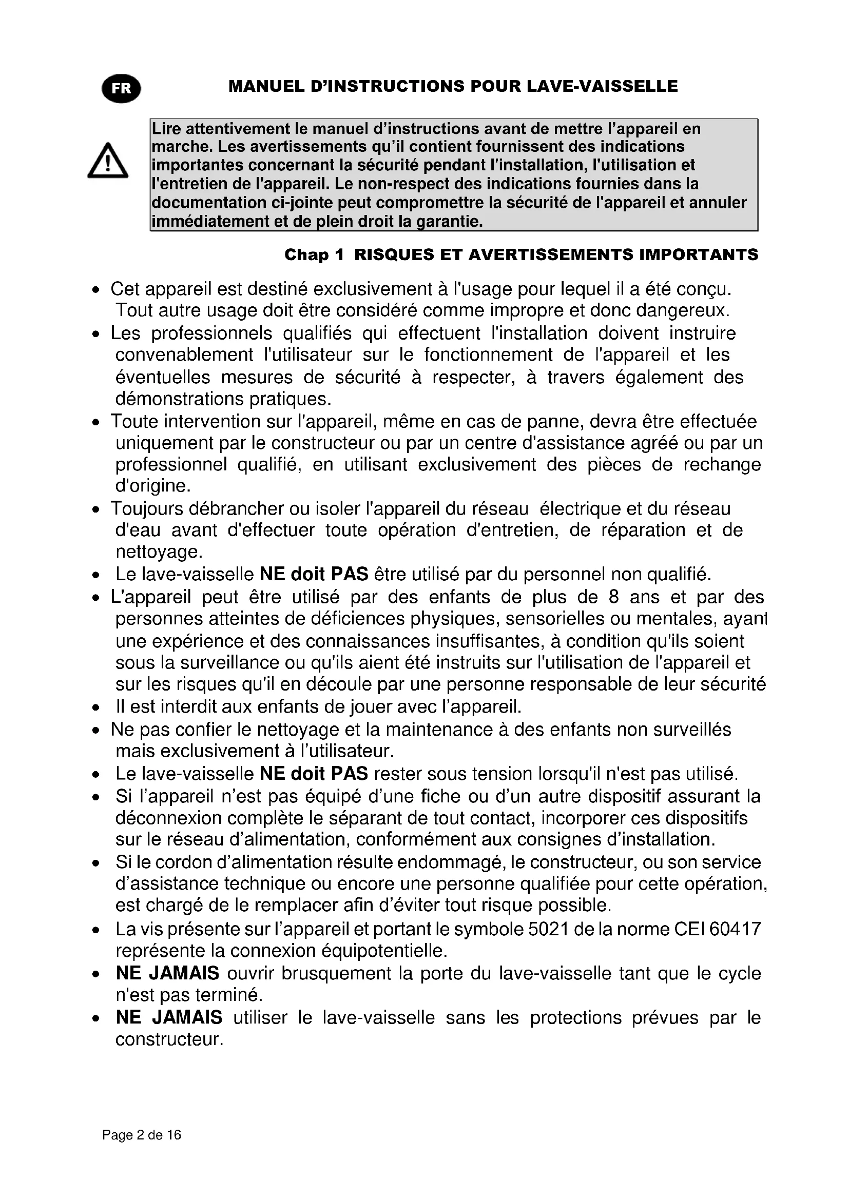 Lire attentivement le manuel d’instructions avant de mettre l’appareil en marche. Les avertissements qu’il contient fournissent des indications importantes concernant la sécurité pendant l'installation, l'utilisation et l'entretien de l'appareil. Le non-respect des indications fournies dans la documentation ci-jointe peut compromettre la sécurité de l'appareil et annuler immédiatement et de plein droit la garantie. Chap 1 RISQUES ET AVERTISSEMENTS IMPORTANTS Cet appareil est destiné exclusivement à l'usage pour lequel il a été conçu. Tout autre usage doit être considéré comme impropre et donc dangereux. Les professionnels qualifiés qui effectuent l'installation doivent instruire convenablement l'utilisateur sur le fonctionnement de l'appareil et les éventuelles mesures de sécurité à respecter, à travers également des démonstrations pratiques. Toute intervention sur l'appareil, même en cas de panne, devra être effectuée uniquement par le constructeur ou par un centre d'assistance agréé ou par un professionnel qualifié, en utilisant exclusivement des pièces de rechange d'origine. Toujours débrancher ou isoler l'appareil du réseau électrique et du réseau d'eau avant d'effectuer toute opération d'entretien, de réparation et de nettoyage. Le lave-vaisselle NE doit PAS être utilisé par du personnel non qualifié. L'appareil peut être utilisé par des enfants de plus de 8 ans et par des personnes atteintes de déficiences physiques, sensorielles ou mentales, ayant une expérience et des connaissances insuffisantes, à condition qu'ils soient sous la surveillance ou qu'ils aient été instruits sur l'utilisation de l'appareil et sur les risques qu'il en découle par une personne responsable de leur sécurité. Il est interdit aux enfants de jouer avec l’appareil. Ne pas confier le nettoyage et la maintenance à des enfants non surveillés mais exclusivement à l’utilisateur. Le lave-vaisselle NE doit PAS rester sous tension lorsqu'il n'est pas utilisé. Si l’appareil n’est pas équipé d’une fiche ou d’un autre dispositif assurant la déconnexion complète le séparant de tout contact, incorporer ces dispositifs sur le réseau d’alimentation, conformément aux consignes d’installation. Si le cordon d’alimentation résulte endommagé, le constructeur, ou son service d’assistance technique ou encore une personne qualifiée pour cette opération, est chargé de le remplacer afin d’éviter tout risque possible. La vis présente sur l’appareil et portant le symbole 5021 de la norme CEI 60417 représente la connexion équipotentielle. NE JAMAIS ouvrir brusquement la porte du lave-vaisselle tant que le cycle n'est pas terminé. NE JAMAIS utiliser le lave-vaisselle sans les protections prévues par le constructeur.MANUEL D’INSTRUCTIONS POUR LAVE-VAISSELLE Page 3 de 16