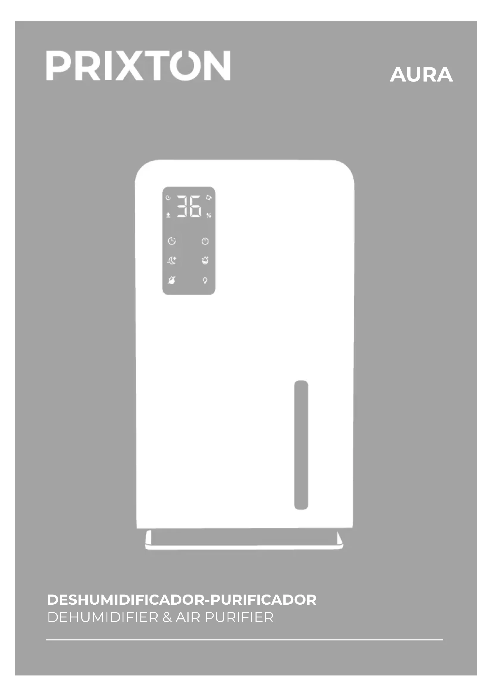 CATEGORY Prixton AURA Dehumidifier Air purifier Home These technical and electrical specifications are those of typical units and may be changed without prior notice in order to provide improved equipment. 12FR Introduction du produit Le déshumidificateur et purificateur d'air 2 en 1 utilise une technologie avancée de réfrigération par semi-conducteurs pour la déshumidification (technologie non traditionnelle de réfrigération par compresseur) et dispose d’une fonction de purification de l’air. Ses avantages sont la déshumidification et la purification, l’économie d’énergie, la protection de l’environnement, la sécurité et la fiabilité. Cette machine convient aux petits espaces, et peut être placée dans la chambre, le bureau, la salle de bain, le dressing, le yacht, la voiture, la cuisine, etc., pour vous aider à éliminer la moisissure causée par l’humidité ainsi que diverses odeurs. Elle maintient un environnement sec et confortable pour éviter que divers objets ne soient endommagés par l’humidité. De plus, la fonction de purification permet d’éliminer efficacement les polluants courants tels que la poussière PM2,5 et le méthanol présents dans une maison neuve, afin que vous puissiez vivre en toute tranquillité. Nom des parties de la machine Indicateur d’allumage/extinction :