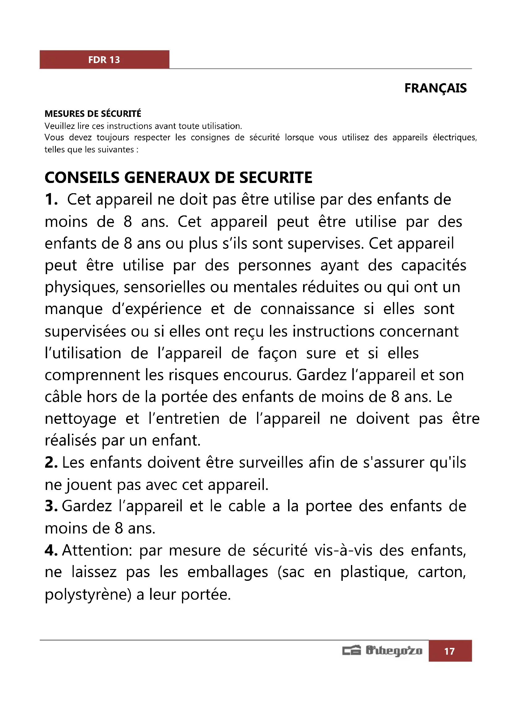 Retrouvez gratuitement la notice de l'appareil FDR 13 Orbegozo au format PDF.
