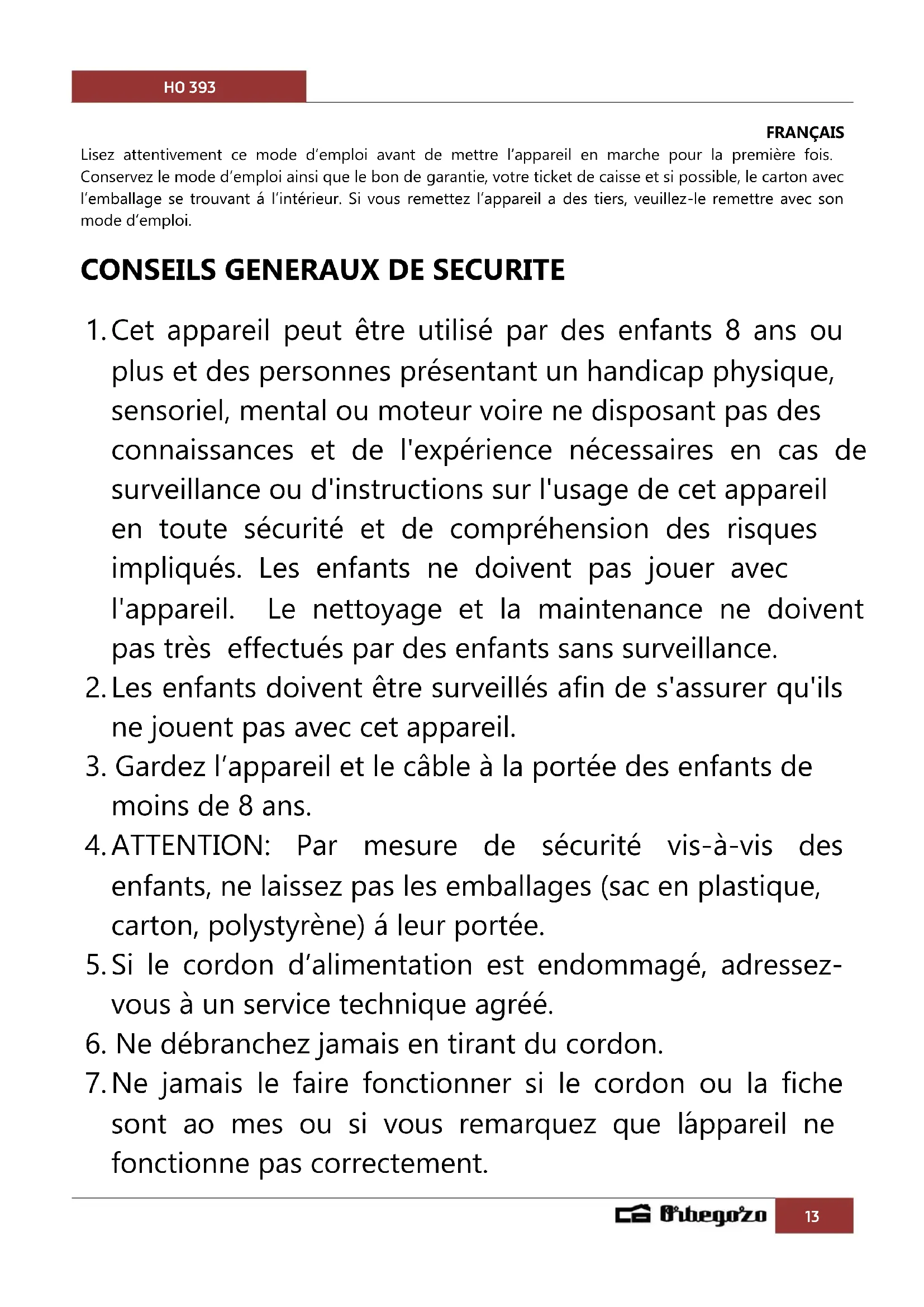 Retrouvez gratuitement la notice de l'appareil HO 393 Orbegozo au format PDF.