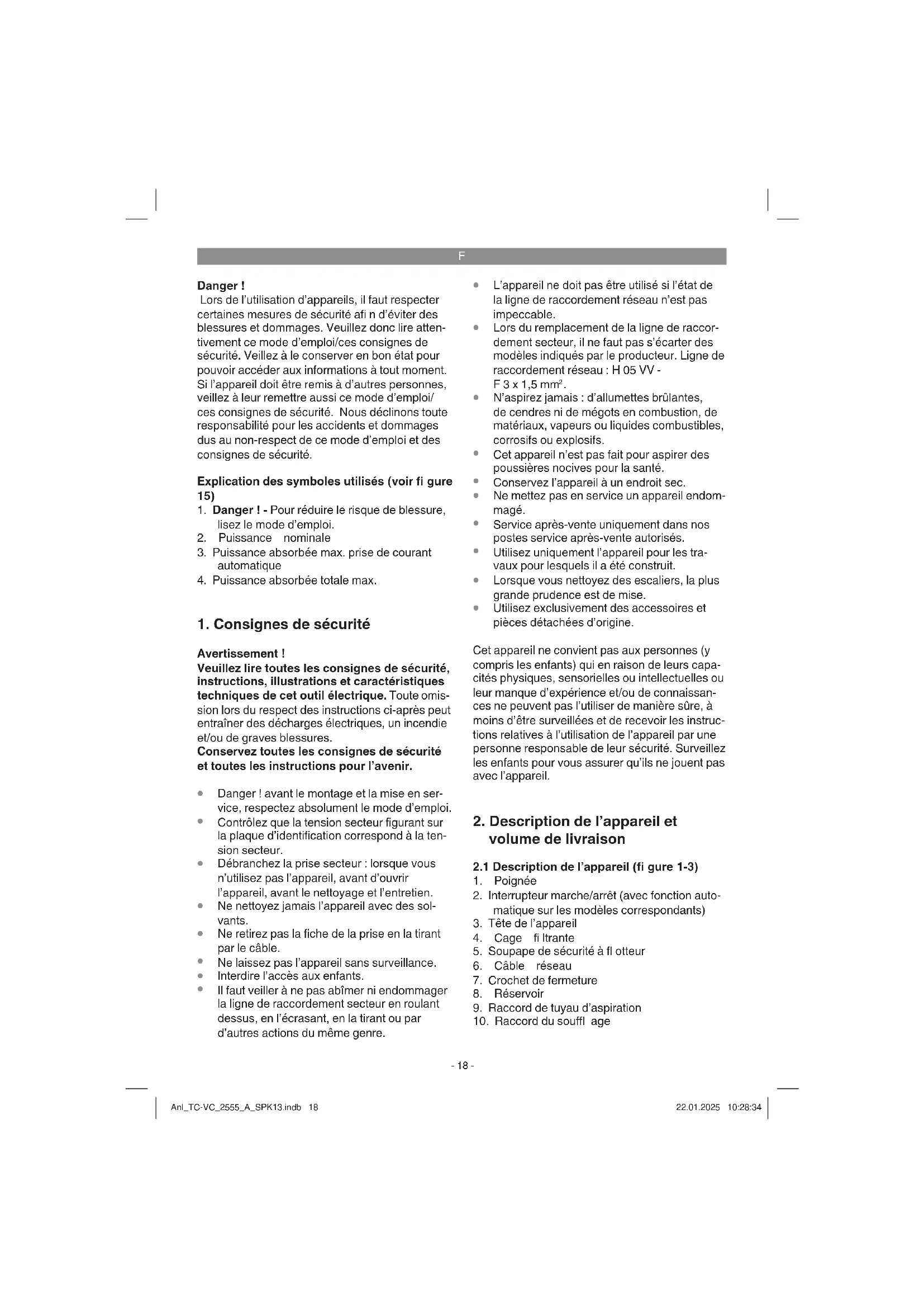 Avertissement ! Assurez-vous, avant de bran- cher la machine, que les données fi gurant sur la plaque signalétique correspondent bien aux don- nées du réseau. L’appareil doit être uniquement branché sur une prise de courant de sécurité ! Anl_TC-VC_2555_A_SPK13.indb 19Anl_TC-VC_2555_A_SPK13.indb 19 22.01.2025 10:28:3422.01.2025 10:28:34F