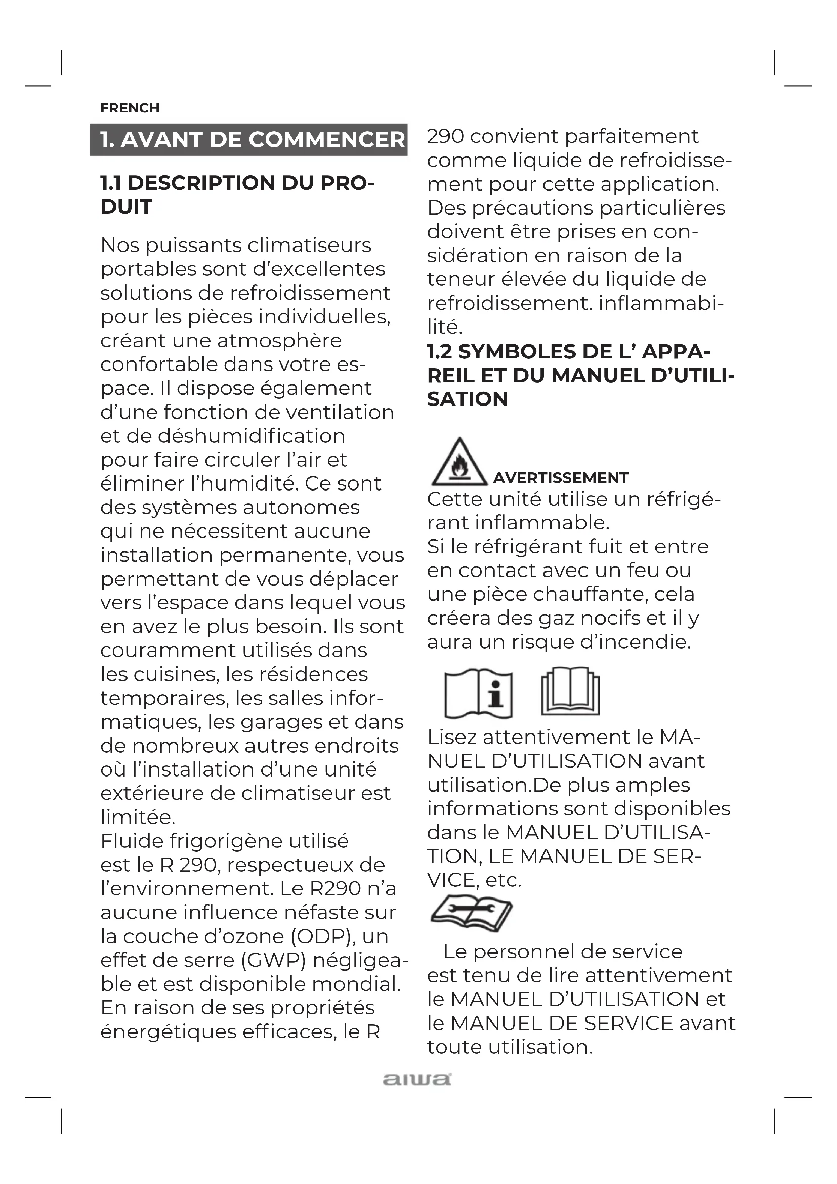 TIONNELLES AVERTISSEMENT - pour réduire le risque d’incendie, de choc électrique ou de blessures aux personnes ou aux biens: ■Veuillez laisser le climatiseur portable debout pendant au moins 24 heures avant de le brancher. ■Si le cordon d’alimentation est endommagé, il doit être remplacé par le fabricant, son agent de service ou des personnes de qualication similaire an d’éviter tout danger. ■L’appareil doit être débran- ché de sa source d’alimenta- tion pendant le service. ■Faites toujours fonctionner l’appareil à partir d’une source d’alimentation de tension, fréquence et puissance nominale éga- les, comme indiqué sur la plaque d’identication du produit. ■Utilisez toujours une prise de courant mise à la terre. ■Débranchez le cordon d’ali- mentation lors du nettoyage ou lorsqu’il n’est pas utilisé. ■Ne pas utiliser avec les mains mouillées. Empêchez l’eau de se répandre sur l’appareil. ■Ne pas immerger ou ex- poser l’appareil à la pluie, à l’humidité ou à tout autre liquide. ■Ne laissez pas l’appareil fonctionner sans survei- llance. N’inclinez pas et ne retournez pas l’ appareil. ■Ne débranchez pas pendant que l’appareil fonctionne. ■Ne débranchez pas en tirant sur le cordon d’alimentation. ■N’utilisez pas de rallonge ouFRENCH de prise adaptateur. ■Ne posez pas d’objets sur l’appareil. ■Ne grimpez pas et ne vous asseyez pas sur l’appareil. ■N’insérez pas les doigts ou d’autres objets dans la sortie d’air. ■Ne touchez pas l’entrée d’air ni les ailettes en aluminium de l’appareil. ■N’utilisez pas l’appareil s’il est tombé, endommagé ou s’il présente des signes de dysfonctionnement du produit. ■Ne nettoyez pas l’appareil avec des produits chimi- ques. ■Assurez-vous que l’appareil est loin du feu, des objets inammables ou explosifs. ■L’unité doit être installée conformément aux régle- mentations nationales en matière de câblage. ■N’utilisez pas de moyens pour accélérer le processus de dégivrage ou pour netto- yer, autres que ceux recom- mandés par le fabricant. ■L’appareil doit être stocké dans une pièce sans sources fonctionnant en continu (par exemple: ammes nues, appareil à gaz en fonction- nement ou radiateur électri- que en fonctionnement). ■L’appareil doit être stocké de manière à éviter tout dom- mage mécanique. ■Ne pas fragmenter ni brûler, même après utilisation. ■Sachez que les réfrigérants peuvent ne pas contenir d’ odeur. ■La tuyauterie doit être pro- tégée contre les dommages physiques et ne doit pas être installée dans un espace non ventilé si cet espace est inférieur à 9 m². ■Le respect des réglementa- tions nationales sur le gaz doit être respecté. ■Gardez toutes les ouvertures de ventilation requises dé- gagées de toute obstruction. ■L’appareil doit être stocké dans un endroit bien ventilé où la taille de la pièce corres- pond à la surface de la pièce spéciée pour le fonctionne- ment. AVERTISSEMENT Toute personne impliquée dans des travaux ou une intrusion dans un circuit de réfrigérant doit détenir un certicat en cours de validité délivré par une autorité d’éva- luation accréditée par l’indus- trie, qui autorise sa compé- tence à manipuler des réfrigérants en toute sécurité conformément à une spéci-FRENCH cation d’évaluation reconnue par l’industrie. AVERTISSEMENT L’entretien ne doit être effec- tué que selon les recomman- dations du fabricant de l’équi- pement. L’entretien et les réparations nécessitant l’as- sistance d’un autre personnel qualié doivent être effectués sous la supervision de la per- sonne compétente dans l’utilisation des réfrigérants inammables. Si vous ne comprenez pas quelque chose ou avez besoin d’aide, veuillez contacter les services du revendeur.