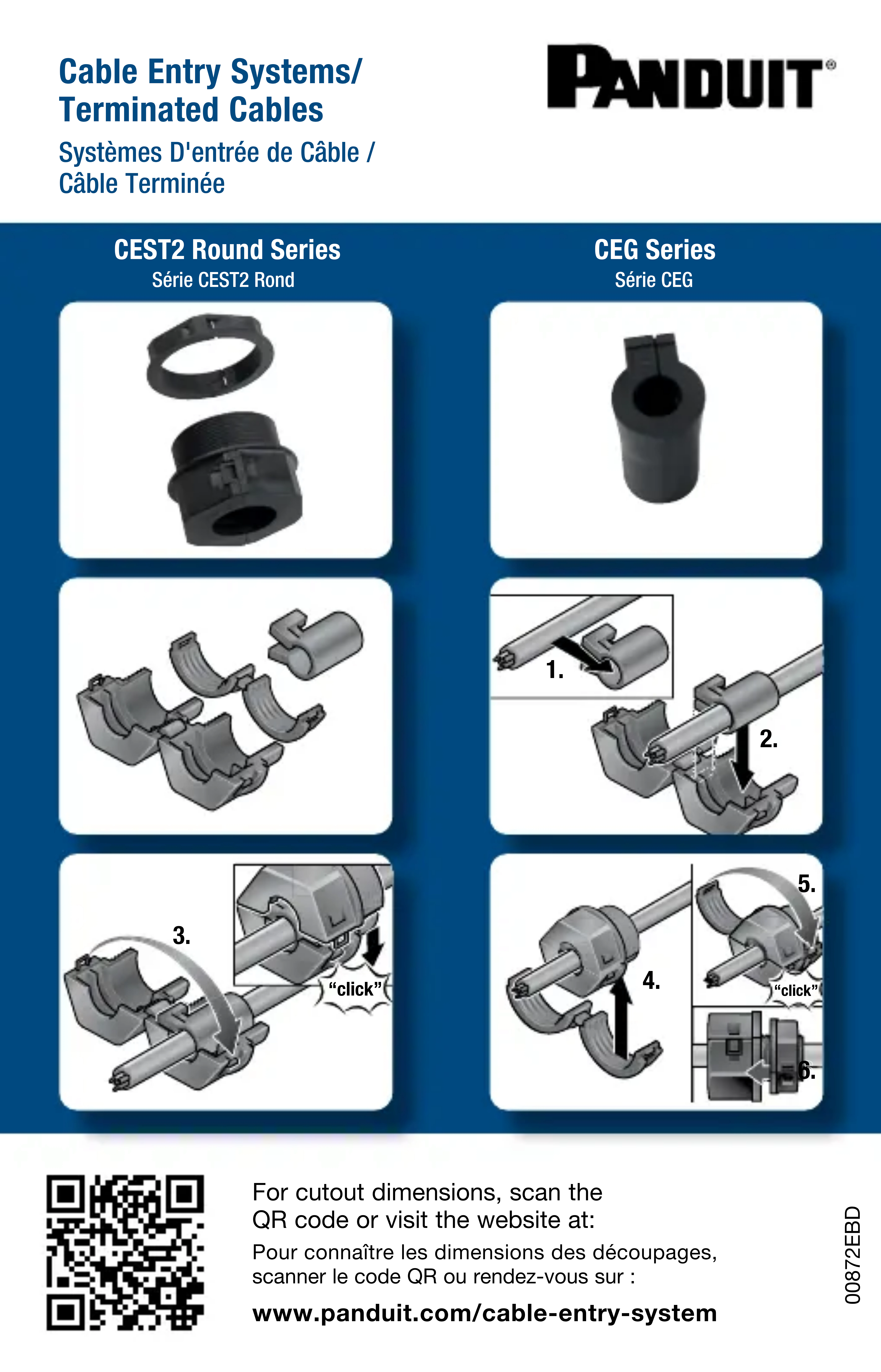 CEG Series Série CEG CEST2 Round Series Série CEST2 Rond00872EBD For cutout dimensions, scan the QR code or visit the website at: Pour connaître les dimensions des découpages, scanner le code QR ou rendez-vous sur : www.panduit.com/cable-entry-system Cable Entry Systems/ Terminated Cables Systèmes D'entrée de Câble / Câble Terminée