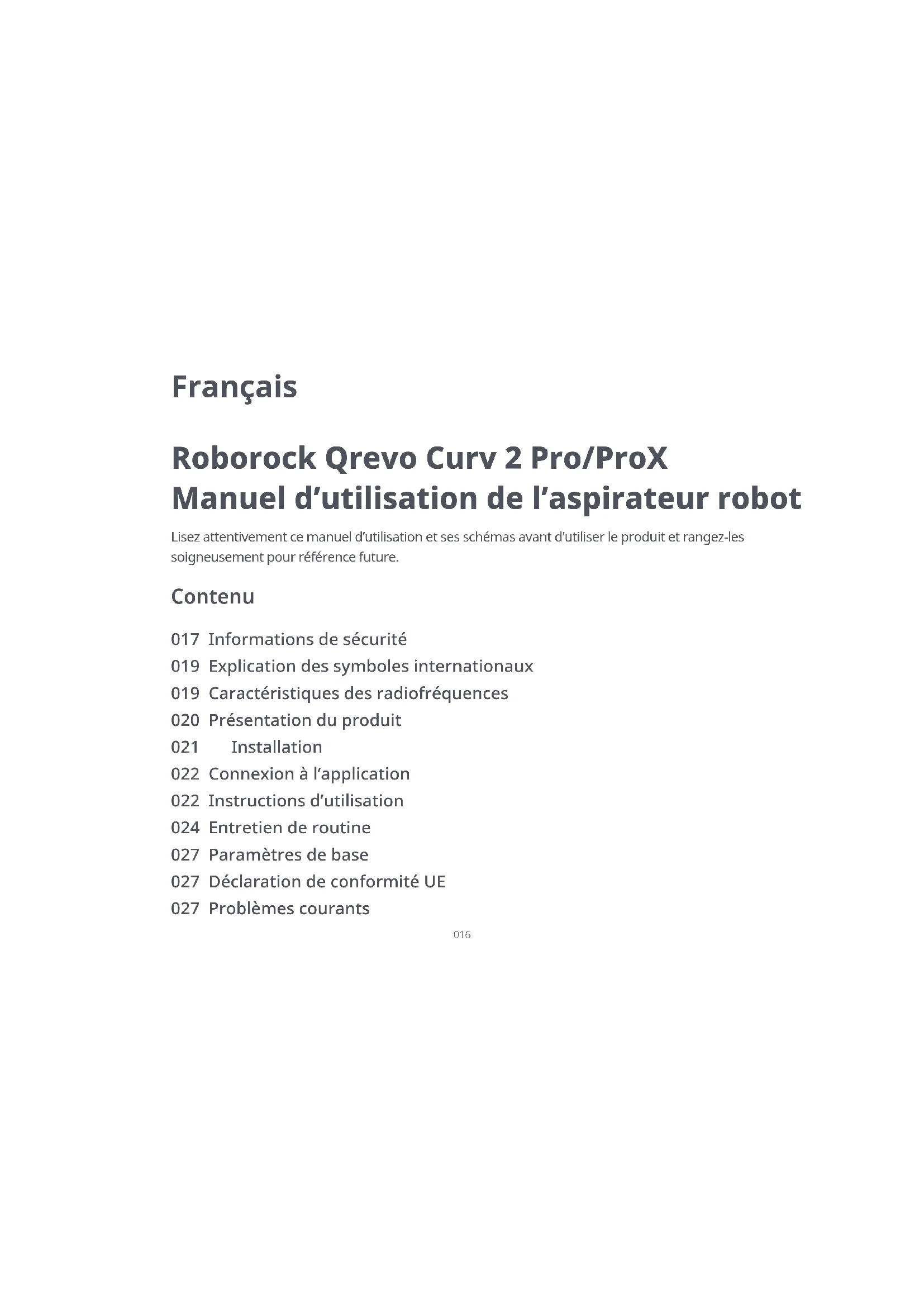 - Check if any foreign objects are in the cleaning tray.016 Français Roborock Qrevo Curv 2 Pro/ProX Lisez attentivement ce manuel d’utilisation et ses schémas avant d’utiliser le produit et rangez-les soigneusement pour référence future. Contenu Manuel d’utilisation de l’aspirateur robot 017 Informations de sécurité 019 Explication des symboles internationaux 019 Caractéristiques des radiofréquences 020 Présentation du produit 021 Installation 022 Connexion à l’application 022 Instructions d’utilisation 024 Entretien de routine 027 Paramètres de base 027 Déclaration de conformité UE 027 Problèmes courants017 Restrictions Informations de sécurité AVERTISSEMENTS