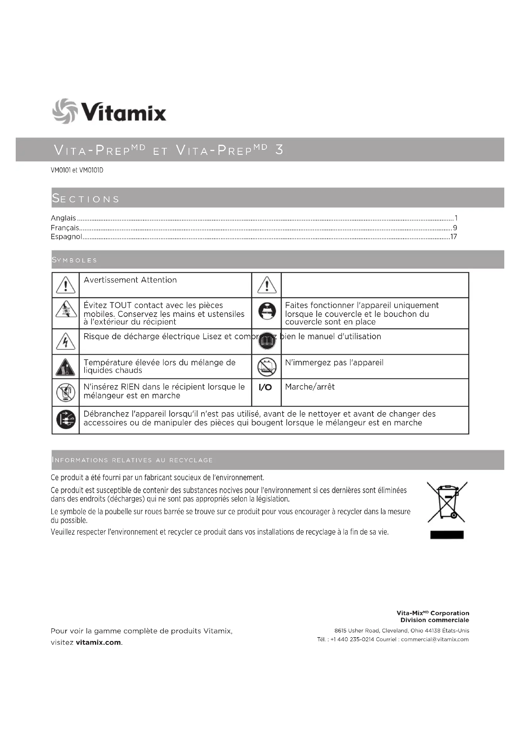 ©2017 Vita-Mix® Corporation. No part of this publication may be reproduced or transmitted in any form or by any means or stored in a database or retrieval system without the written permission of the Vita-Mix® Corporation.9 Se c t i o n S Ce produit a été fourni par un fabricant soucieux de l'environnement. Ce produit est susceptible de contenir des substances nocives pour l'environnement si ces dernières sont éliminées dans des endroits (décharges) qui ne sont pas appropriés selon la législation. Le symbole de la poubelle sur roues barrée se trouve sur ce produit pour vous encourager à recycler dans la mesure du possible. Veuillez respecter l'environnement et recycler ce produit dans vos installations de recyclage à la fin de sa vie. in foRmat i o n S R e l at i V e S au R e c yc l ag e Sy m b o l e S Avertissement Attention Évitez TOUT contact avec les pièces mobiles. Conservez les mains et ustensiles à l'extérieur du récipient Faites fonctionner l'appareil uniquement lorsque le couvercle et le bouchon du couvercle sont en place Risque de décharge électrique Lisez et comprenez bien le manuel d'utilisation Température élevée lors du mélange de liquides chauds N'immergez pas l'appareil N'insérez RIEN dans le récipient lorsque le mélangeur est en marche Marche/arrêt Débranchez l'appareil lorsqu'il n'est pas utilisé, avant de le nettoyer et avant de changer des accessoires ou de manipuler des pièces qui bougent lorsque le mélangeur est en marche l/O Pour voir la gamme complète de produits Vitamix, visitez vitamix.com.Vita-Mix CorporationDivision commerciale 8615 Usher Road, Cleveland, Ohio 44138 États-Unis Tél.: +1 440 235-0214 Courriel: commercial@vitamix.com Anglais ..................................................................................................................................................................................................................... 1 Français...................................................................................................................................................................................................................9 Espagnol ................................................................................................................................................................................................................ 17 VM0101 et VM0101D Vi t a -PR e P