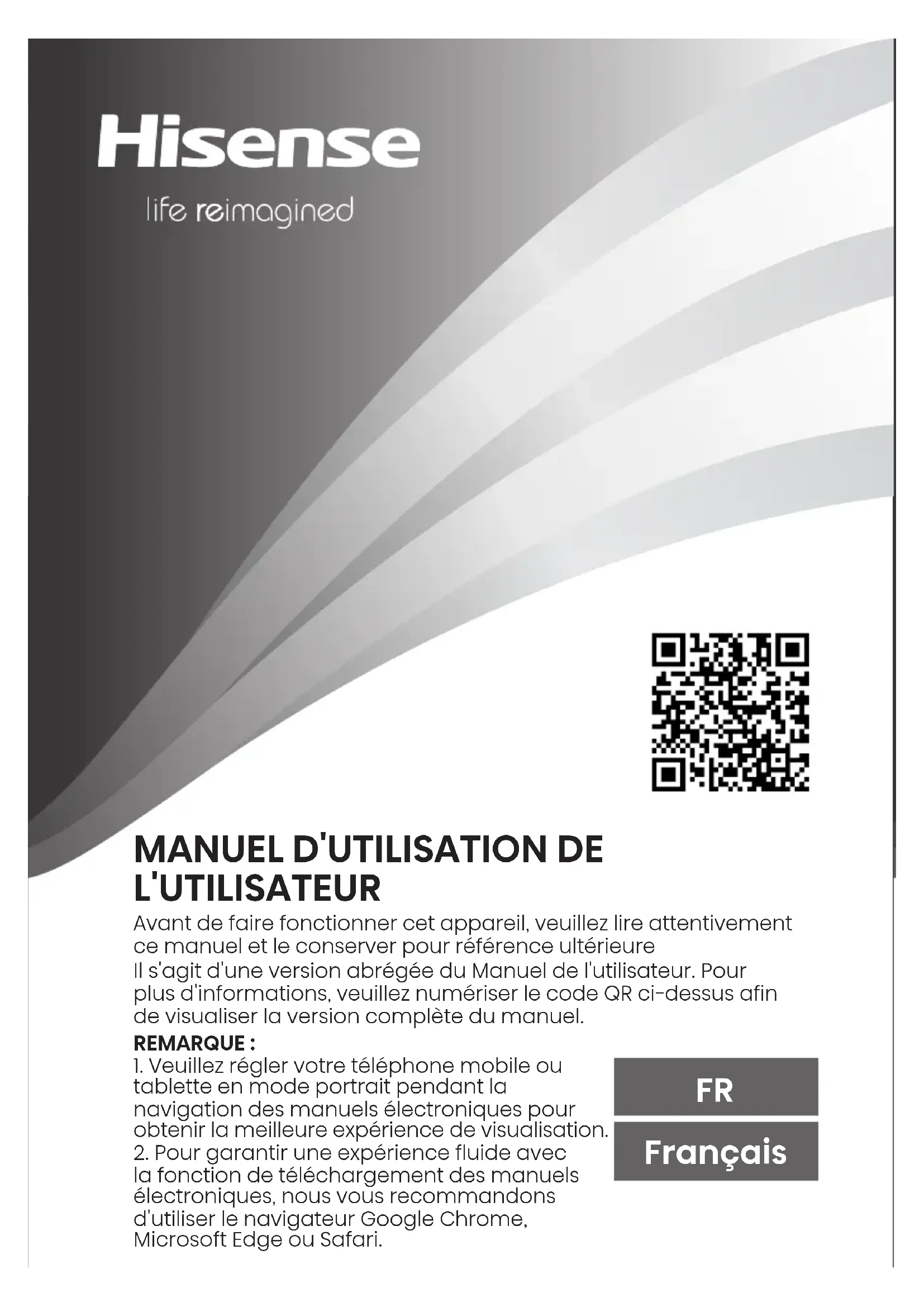 L'UTILISATEUR Avant de faire fonctionner cet appareil, veuillez lire attentivement ce manuel et le conserver pour référence ultérieure Il s'agit d'une version abrégée du Manuel de l'utilisateur. Pour plus d'informations, veuillez numériser le code QR ci-dessus afin de visualiser la version complète du manuel. REMARQUE :