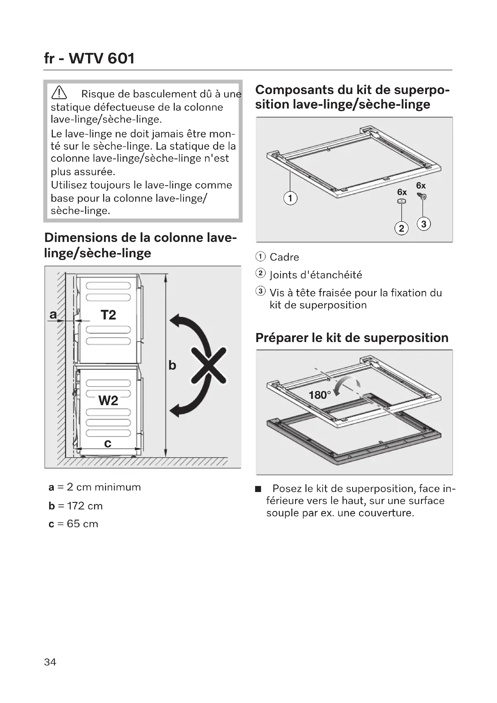 koneeseen uusi kansi. 33fr - WTV 601 Risque de basculement dû à une statique défectueuse de la colonne lave-linge/sèche-linge. Le lave-linge ne doit jamais être mon- té sur le sèche-linge. La statique de la colonne lave-linge/sèche-linge n'est plus assurée. Utilisez toujours le lave-linge comme base pour la colonne lave-linge/ sèche-linge. Dimensions de la colonne lave- linge/sèche-linge