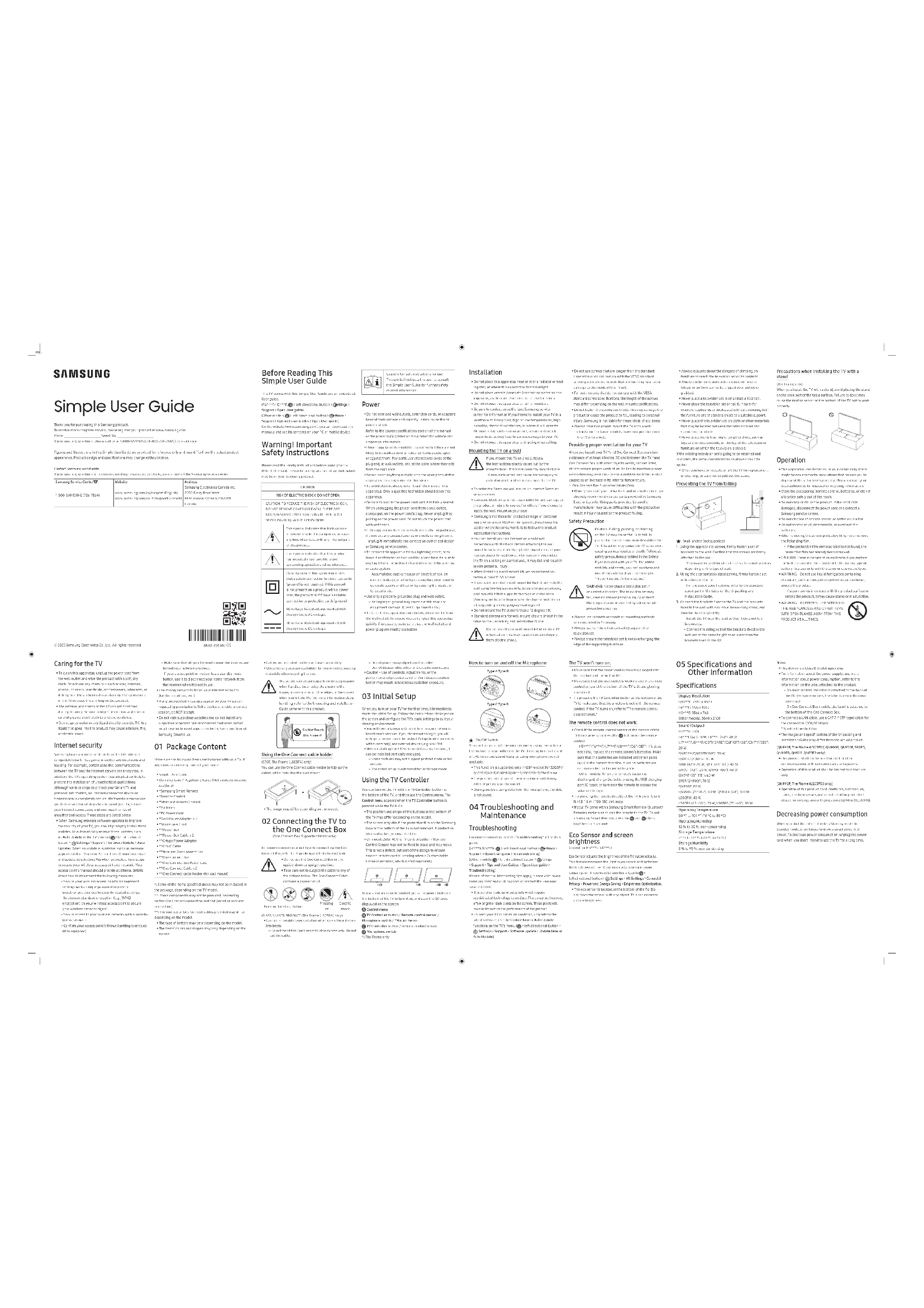- The eco sensor is located at the bottom of the TV. Do not block the sensor with any object. This can decrease picture brightness. 05 Specifications and Other Information Specifications Display Resolution QN9**F: 7680 x 4320F6***F: 1920 x 1080H5***F: 1366 x 768Other models: 3840 x 2160 Sound (Output) H5***F: 10 WF6***F (32"): 10 W, F6***F (40"): 20 WU7***F/U8***F/QEF1/QN1EF/Q6F/Q7F/Q8F/QN7*F/S85F: 20 W QN80FA/QN80FF(100"): 30 WQN80FD/QN85F: 40 WS90F (42"): 20 W, S90F (48"-83"): 40 WQN90F (43"): 20 W, QN90F (50"): 40 WQN9*F (55"-115"): 60 WS95F/QN900F: 70 WQN950F: 80 WQN990F (65"-85"): 90 W, QN990F (98"): 120 WLS03FW: 40 WLS03FA (43"-50"): 20 W, LS03FA (55"-65"): 40 W Operating Temperature 50 °F to 104 °F (10 °C to 40 °C) Operating Humidity 10 % to 80 %, non-condensing Storage Temperature -4 °F to 113 °F (-20 °C to 45 °C) Storage Humidity 5 % to 95 %, non-condensing ENG Notes • This device is a Class B digital apparatus. • For information about the power supply, and more information about power consumption, refer to the information on the label attached to the product. – On most models, the label is attached to the back of the TV. (On some models, the label is inside the cover terminal.) – On One Connect Box models, the label is attached to the bottom of the One Connect Box. • To connect a LAN cable, use a CAT 7 (*STP type) cable for the connection. (100/10 Mbps)* Shielded Twisted Pair • The images and specifications of the Unpacking and Installation Guide may differ from the actual product.[QN990F, The Frame (LS03FW), QN900F, QN950F, S90FD, QN90FD, QN92F, QN85FD only] • This product shall not be used for control of or communications with unmanned aircraft systems. • Operation of this product shall be limited to indoor use only.[QN990F, The Frame (LS03FW) only] • Operation of this product on oil platforms, automobiles, trains, maritime vessels and aircraft shall be prohibited except for on large aircraft flying above 3,048 m (10,000 ft). Decreasing power consumption When you shut the TV off, it enters Standby mode. In Standby mode, it continues to draw a small amount of power. To decrease power consumption, unplug the power cord when you don't intend to use the TV for a long time. Simple User Guide Thank you for purchasing this Samsung product.To receive more complete service, please register your product at www.samsung.comModel Serial No. If you have any questions, please call us at 1-800-SAMSUNG (1-800-726-7864) for assistance. Figures and illustrations in this Simple User Guide are provided for reference only and may differ from the actual product appearance. Product design and specifications may change without notice.Contact Samsung world wideIf you have any questions or comments relating to Samsung products, please contact the Samsung service center.Samsung Service Center Website Address1-800-SAMSUNG (726-7864)www.samsung.com/ca/support (English)www.samsung.com/ca_fr/support (French)Samsung Electronics Canada Inc.2050 Derry Road WestMississauga, Ontario L5N 0B9Canada -00© 2025 Samsung Electronics Co., Tous droits réservés. Avant de lire ce Guide d'utilisation simple Ce téléviseur comprend ce Guide d'utilisation simple et un guide de l'utilisateur intégré.(F6***F/H5***F: > touche directionnelle vers la gauche > Paramètres > Support tech. > Ouvrir le guide de l’utilisateur) > touche directionnelle vers la gauche > Paramètres > Support tech. > Conseils et guides de l’utilisateur > Ouvrir le guide de l’utilisateur) Sur le site Web (www.samsung.com), vous pouvez télécharger le guide d'utilisation et voir son contenu sur votre ordinateur ou votre appareil mobile. Avertissement! Consignes de sécurité importantes Avant d'utiliser le téléviseur, veuillez lire les instructions de sécurité.Consultez le tableau ci-dessous pour connaître la signification des symboles qui pourraient se trouver sur votre appareil Samsung.MISE EN GARDERISQUE DE DÉCHARGE ÉLECTRIQUE. NE PAS OUVRIR.MISE EN GARDE : AFIN DE RÉDUIRE LE RISQUE DE CHOC ÉLECTRIQUE, N'ENLEVEZ PAS LE COUVERCLE (OU LE PANNEAU ARRIÈRE). AUCUNE PIÈCE POUVANT ÊTRE RÉPARÉE PAR L'UTILISATEUR NE SE TROUVE À L'INTÉRIEUR. VEUILLEZ VOUS ADRESSER À UN TECHNICIEN AGRÉÉ POUR TOUTE RÉPARATION.Ce symbole indique la présence d'une haute tension à l'intérieur. Tout contact avec une pièce interne de l'appareil présente un danger.Ce symbole vous informe qu'une documentation importante relative au fonctionnement et à l'entretien est fournie avec le produit.qu'une connexion de sécurité de mise à la terre (à la masse) n'est pas requise. Si ce symbole ne se trouve pas sur un appareil doté d’un cordon d’alimentation, le produit DOIT avoir un conducteur de protection fiable (mise à la terre).par ce symbole est la tension CA.par ce symbole est la tension CC.Mise en garde. Consultez les instructions aux fins d'utilisation : Ce symbole indique à l'utilisateur qu'il doit consulter le Guide d'utilisation simple pour avoir de l'information au sujet de la sécurité. Mise sous tension