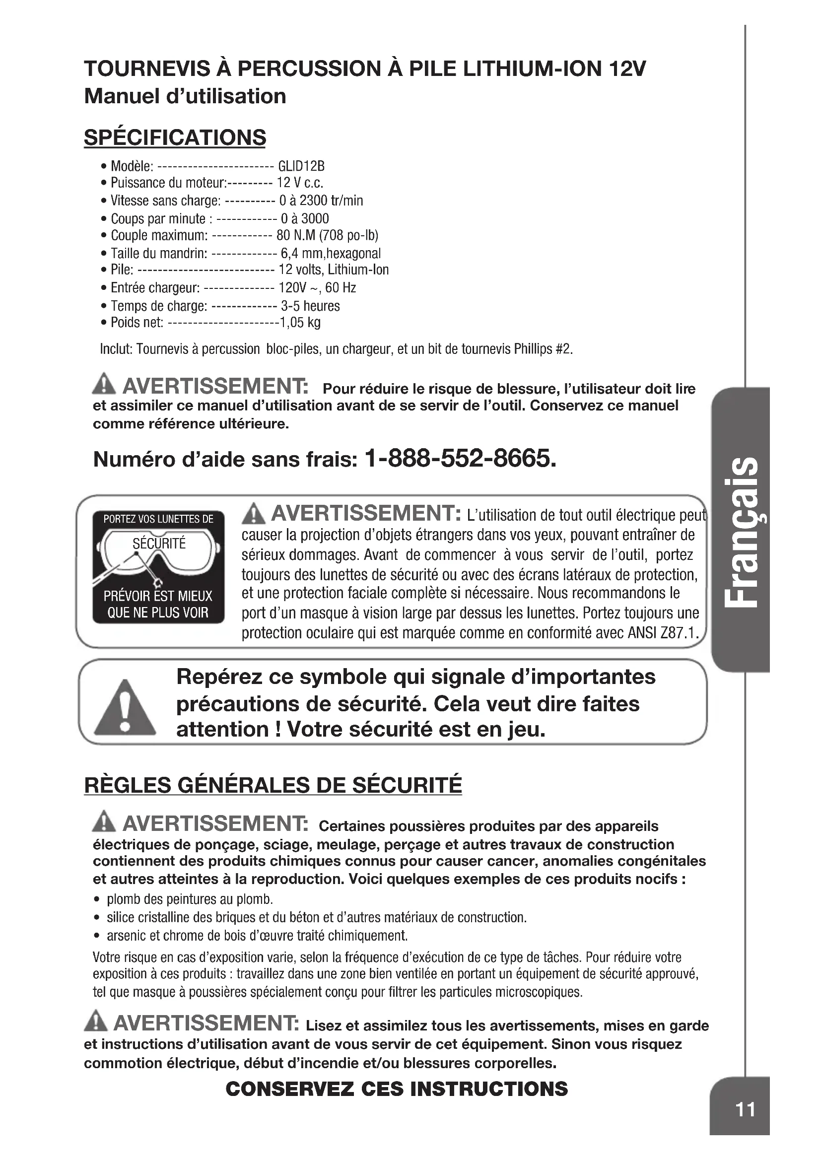AVERTISSEMENT: Pour réduire le risque de blessure, l'utilisateur doit lire et assimiler ce manuel d'utilisation avant de se servir de l'outil. Conservez ce manuel comme référence ultérieure.