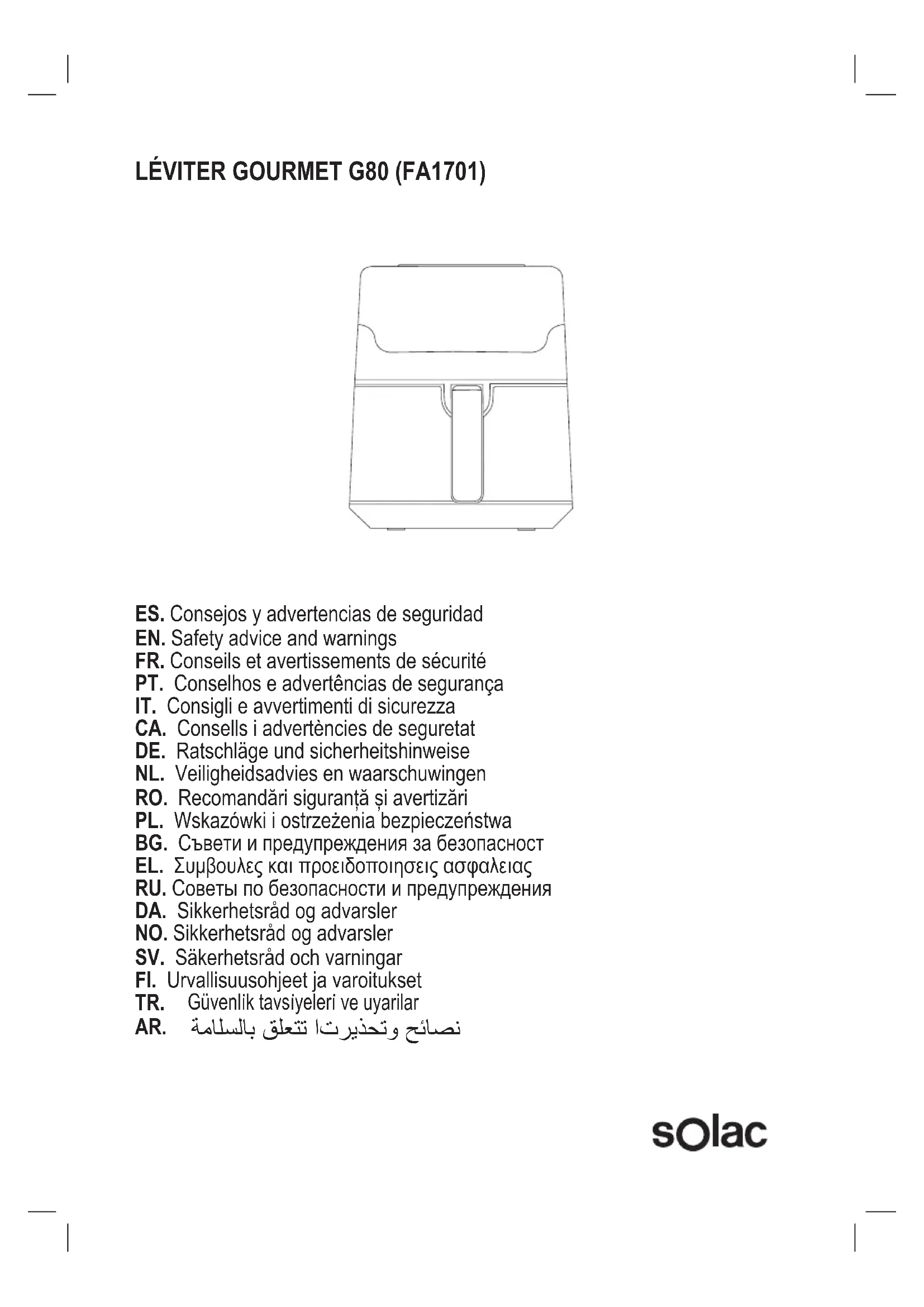 FRITEUSE À AIR FA1701 Cher Client, Nous vous remercions d’avoir acheté un produit SOLAC. Sa technologie, son design et sa fonctionnalité, outre sa parfaite conformité aux normes de qualité les plus strictes, vous permettront d'en tirer une longue et durable satisfaction.
