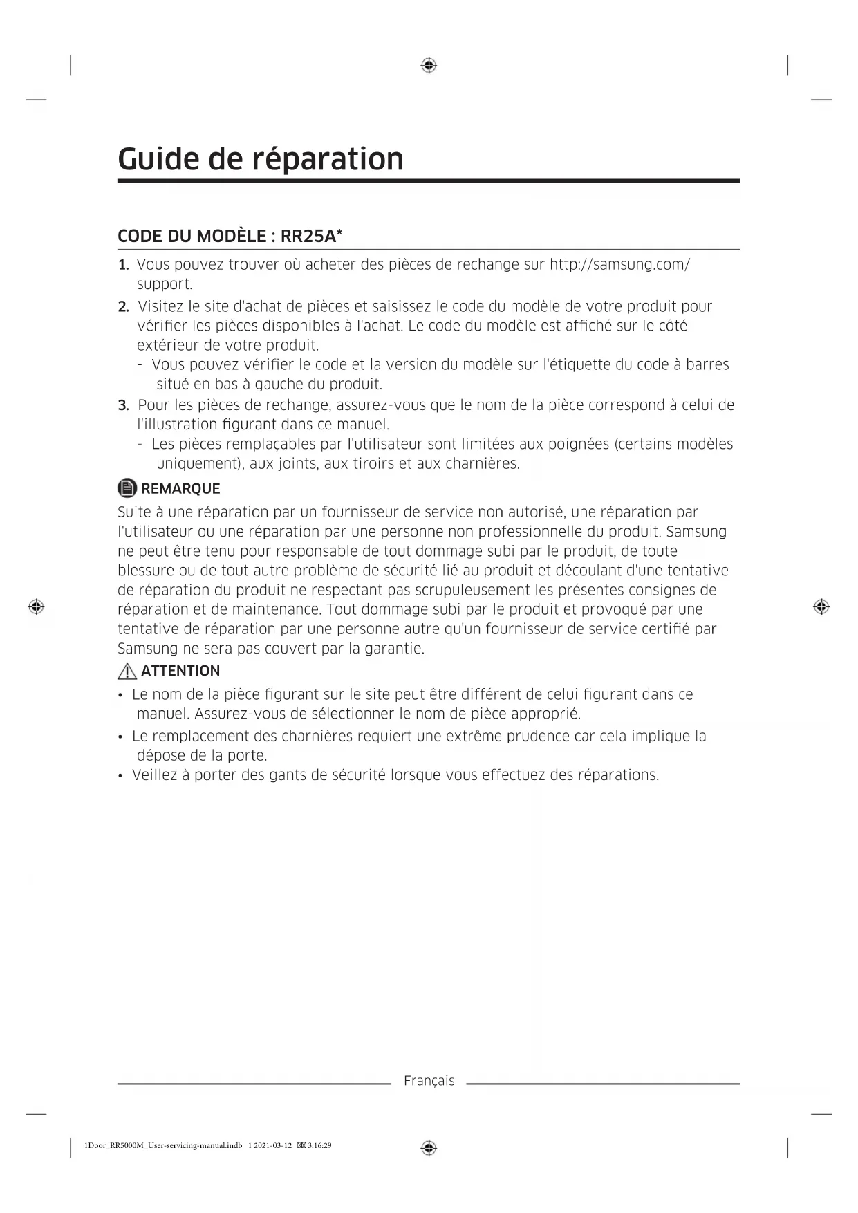 - Veillez à porter des gants de sécurité lorsque vous effectuez des réparations. 1Door_RR5000M_User-servicing-manual.indb 1 2021-03-12 3:16:29Français L'apparence réelle et les pièces fournies avec le réfrigérateur peuvent varier en fonction du modèle et du pays.