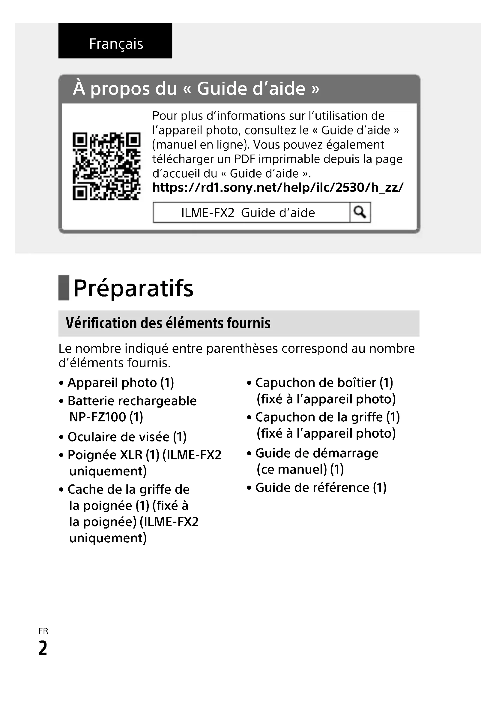 À propos du «Guide d’aide» Pour plus d’informations sur l’utilisation de l’appareil photo, consultez le «Guide d’aide» (manuel en ligne). Vous pouvez également télécharger un PDF imprimable depuis la page d’accueil du «Guide d’aide».https://rd1.sony.net/help/ilc/2530/h_zz/ILME-FX2 Guide d’aide Français Préparatifs Vérification des éléments fournis Le nombre indiqué entre parenthèses correspond au nombre d’éléments fournis.• Appareil photo (1)• Batterie rechargeable NP-FZ100 (1)• Oculaire de visée (1) • Poignée XLR (1) (ILME-FX2 uniquement)• Cache de la griffe de la poignée (1) (fixé à la poignée) (ILME-FX2 uniquement)• Capuchon de boîtier (1) (fixé à l’appareil photo)• Capuchon de la griffe (1) (fixé à l’appareil photo)• Guide de démarrage (cemanuel) (1)• Guide de référence (1)FR