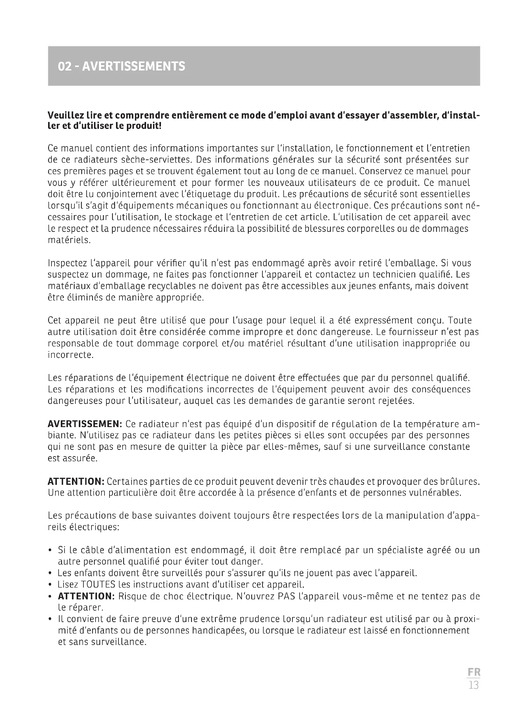 AVERTISSEMENT: Ce radiateur n'est pas équipé d'un dispositif de régulation de la température. N'utilisez pas ce radiateur dans les petites pièces si elles sont occupées par des personnes qui ne sont pas en mesure de quitter la pièce par elles-mêmes, sauf si une surveillance constante est assurée.