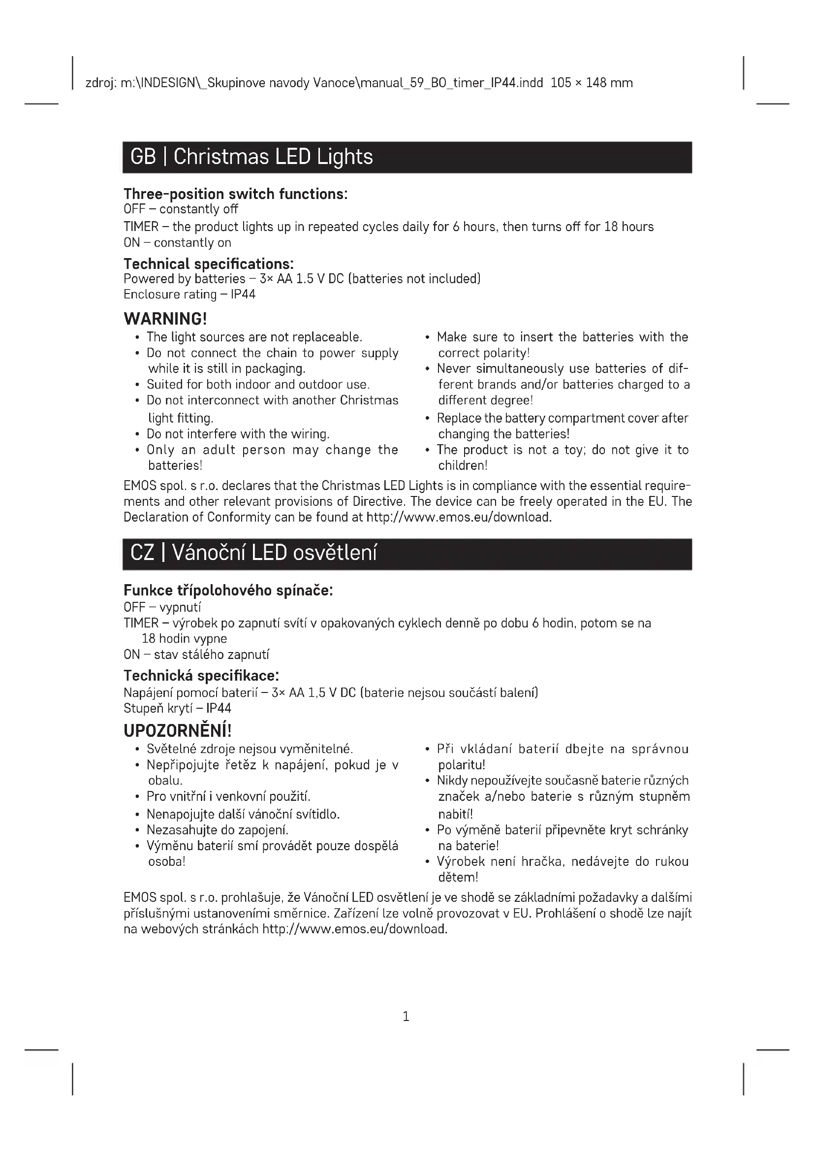 - Le produit n‘est pas un jouet ; ne le mettez pas entre les mains des enfants ! EMOS spol. s r. o. déclare que les Luminaire de Noël LED est en conformité avec les essentiels exigences et autres pertinentes dispositions de la directive . L‘ appareil peut être utilisé librement dans l‘ UE. La déclaration de conformité peut être trouvé à http://www.emos.eu/download. IT | Luci di Natale con LED Funzioni dell‘interruttore a tre posizioni: OFF – costantemente spento TIMER – il prodotto si accende a cicli ripetuti giornalmente per 6 ore, quindi si spegne per 18 ore ON – costantemente acceso Speciche tecniche: Alimentazione a batterie – 3× AA 1,5 V DC (batterie non incluse) Grado di protezione – IP44 ATTENZIONE!