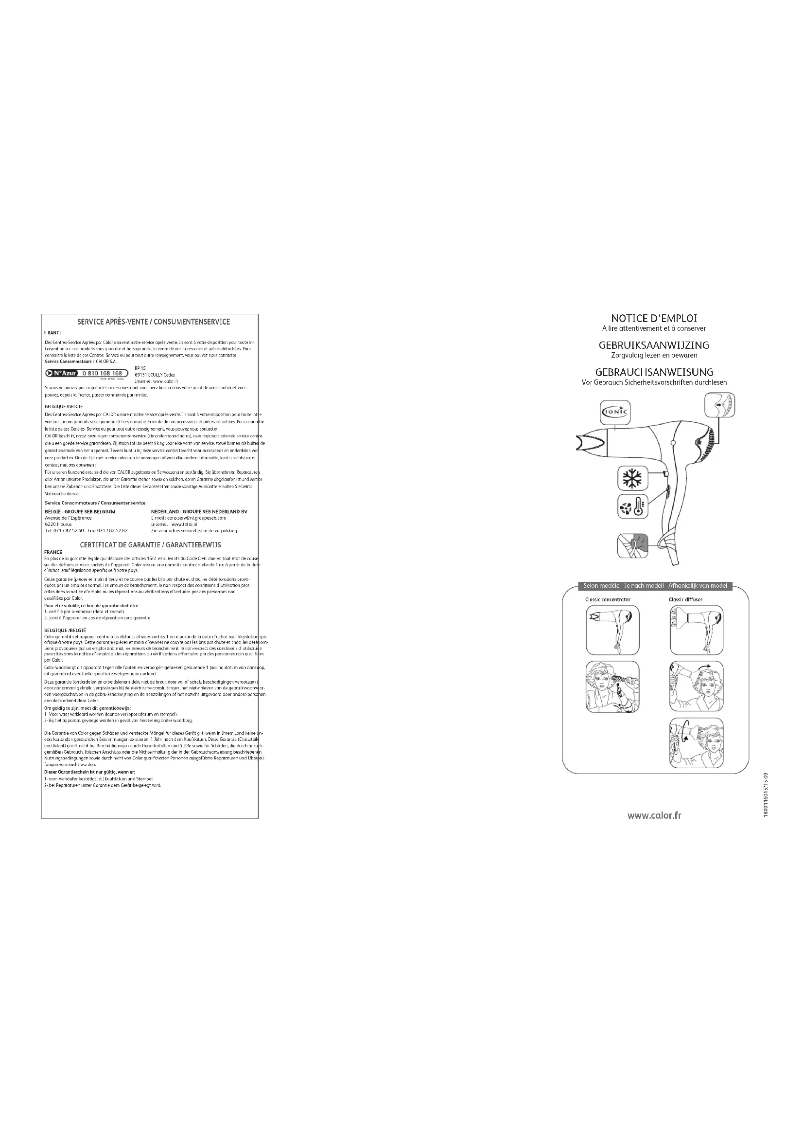 es Centres-Service Agréés par Calor assurent notre service après-vente. Ils sont à votre disposition pour toute in- ervention sur nos produits sous garantie et hors garantie, la vente de nos accessoires et pièces détachées. Pourconnaître la liste de ces Centres- Service ou pour tout autre renseignement, vous pouvez nous contacter :Service Consommateurs : CALOR S.A.BP 1569131 ECULLY Cedex Internet : www. calor. frSi vous ne pouvez pas acquérir les accessoires dont vous avez besoin dans votre point de vente habituel, vouspouvez, depuis la France, passer commande par minitel.BELGIQUE /BELGIË es Centres-Service Agréés par CALOR assurent notre service après-vente. Ils sont à votre disposition pour toute inter- ention sur nos produits sous garantie et hors garantie, la vente de nos accessoires et pièces détachées. Pour connaîtrela liste de ces Centres- Service ou pour tout autre renseignement, vous pouvez nous contacter :CALOR beschikt, naast onze eigen consumentenservice (zie onderstaand adres), over regionale erkende service-centradie u een goede service garanderen. Zij staan tot uw beschikking voor elke vorm van service, zowel binnen als buiten degarantieperiode van het apparaat. Tevens kunt u bij deze service-centra terecht voor accessoires en onderdelen van nze producten. Om de lijst met service-adressen te ontvangen of voor elke andere informatie, kunt u rechtstreekscontact met ons opnemen :Für unseren Kundendienst sind die von CALOR zugelassenen Servicezentren zuständig. Sie übernehmen Reparaturenaller Art an unseren Produkten, die unter Garantie stehen sowie an solchen, deren Garantie abgelaufen ist und vertrei-ben unsere Zubehör- und Ersatzteile. Die Liste dieser Servicezentren sowie sonstige Auskünfte erhalten Sie beim: erbraucherdienst:Service Consommateurs / Consumentenservice :