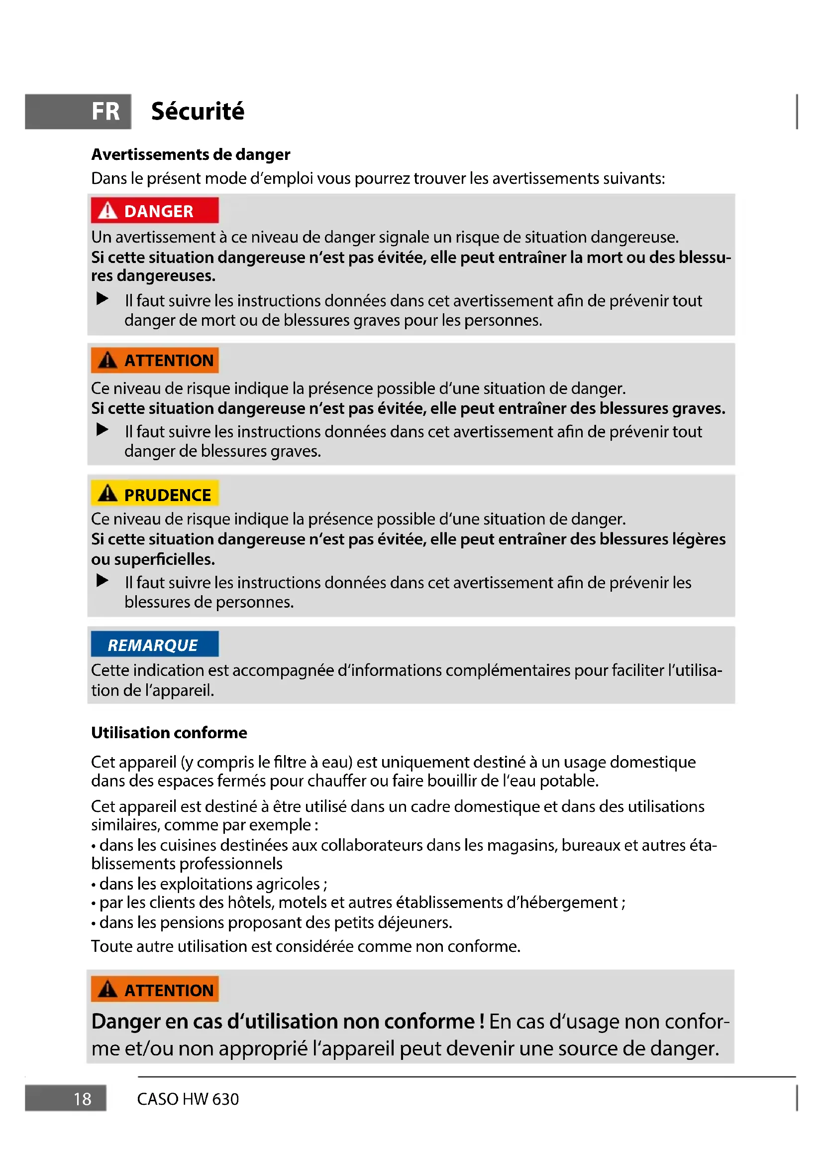 - De elektrische veiligheid van het apparaat is alleen dan gegarandeerd wanneer het is aangesloten aan een reglementair geïnstalleerd systeem met aardkabels en veilig- heidschakelaars. Laat u in geval van twijfel de huisinstallatie controleren door een erkende elektricien. De fabrikant kan niet aansprakelijk worden gesteld voor schaden, die door een gebrekkige of onderbroken aardingskabel veroorzaakt worden.18 CASO HW 630 FR Sécurité Avertissements de danger Dans le présent mode d‘emploi vous pourrez trouver les avertissements suivants: Un avertissement à ce niveau de danger signale un risque de situation dangereuse. Si cette situation dangereuse n‘est pas évitée, elle peut entraîner la mort ou des blessu- res dangereuses. f Il faut suivre les instructions données dans cet avertissement an de prévenir tout danger de mort ou de blessures graves pour les personnes. Ce niveau de risque indique la présence possible d‘une situation de danger. Si cette situation dangereuse n‘est pas évitée, elle peut entraîner des blessures graves. f Il faut suivre les instructions données dans cet avertissement an de prévenir tout danger de blessures graves. Ce niveau de risque indique la présence possible d‘une situation de danger. Si cette situation dangereuse n‘est pas évitée, elle peut entraîner des blessures légères ou supercielles. f Il faut suivre les instructions données dans cet avertissement an de prévenir les blessures de personnes. Cette indication est accompagnée d‘informations complémentaires pour faciliter l‘utilisa- tion de l‘appareil. Utilisation conforme Cet appareil (y compris le ltre à eau) est uniquement destiné à un usage domestique dans des espaces fermés pour chauer ou faire bouillir de l‘eau potable. Cet appareil est destiné à être utilisé dans un cadre domestique et dans des utilisations similaires, comme par exemple :
