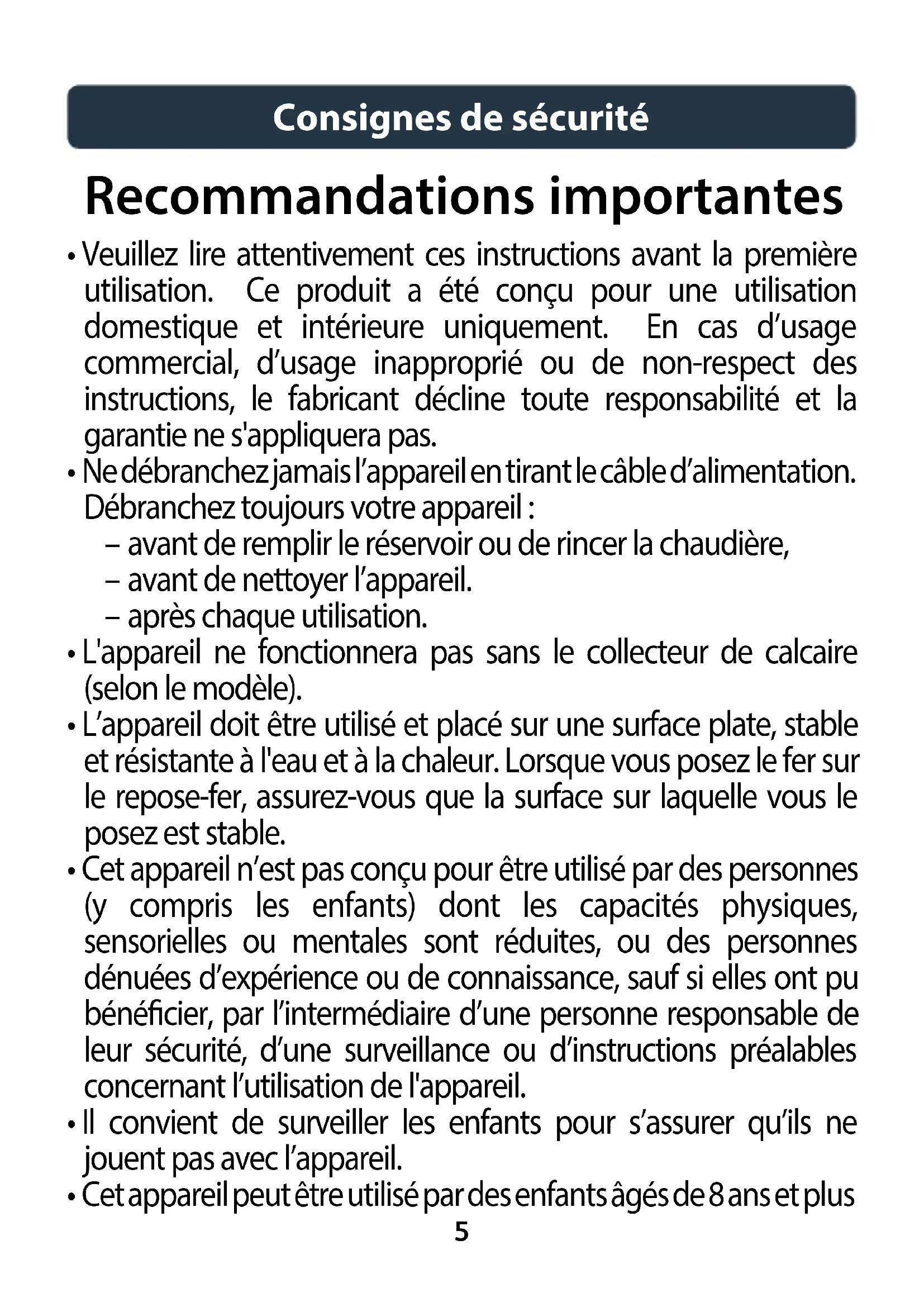 - Votre centrale vapeur est un appareil électrique: il doit être utilisé dans des conditions normales d’utilisation. Cet appareil est conçu pour une utilisation exclusivement domestique.
