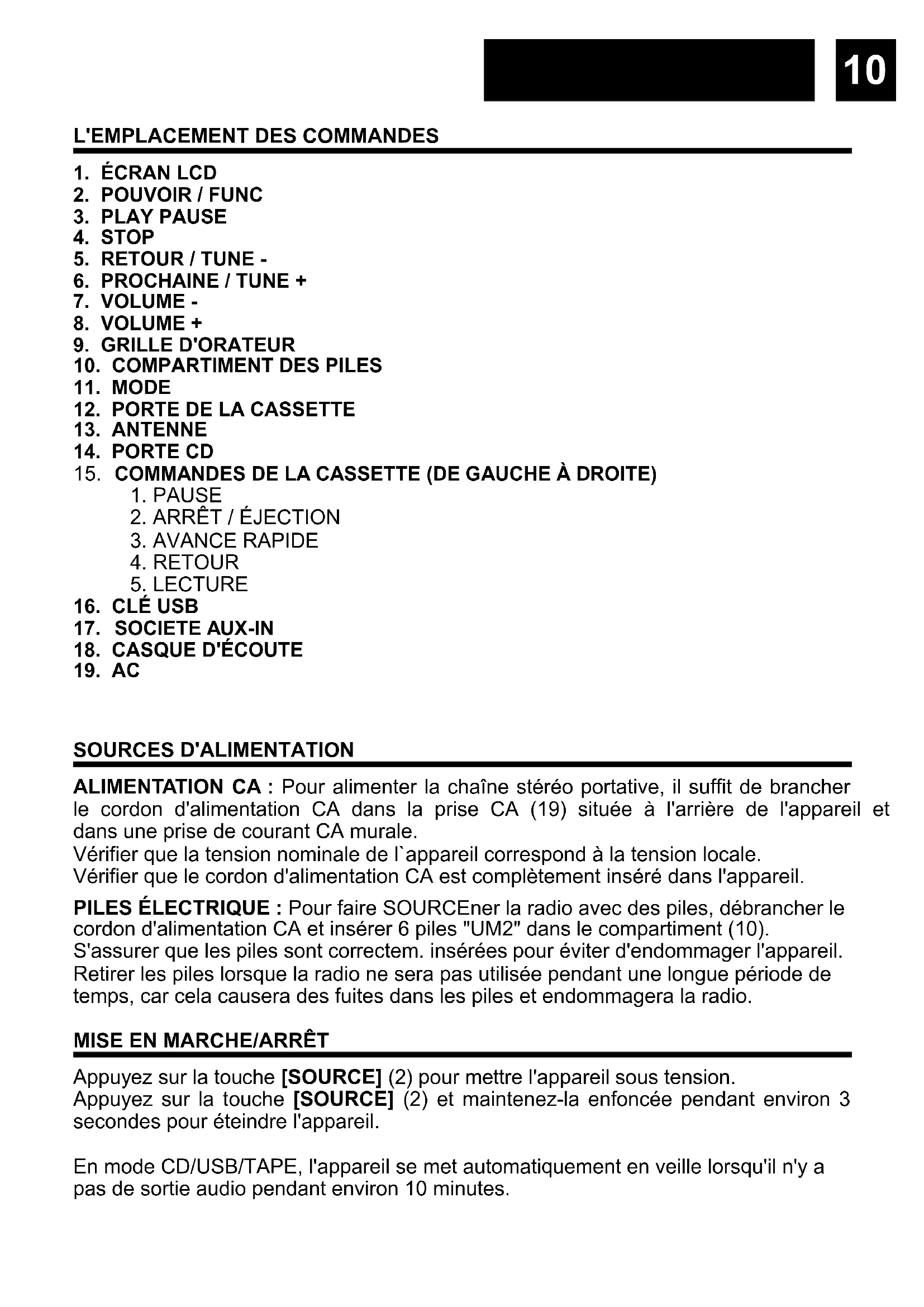 SOURCES D'ALIMENTATION ALIMENTATION CA : Pour alimenter la chaîne stéréo portative, il suffit de brancher le cordon d'alimentation CA dans la prise CA (19) située à l'arrière de l'appareil et dans une prise de courant CA murale. Vérifier que la tension nominale de l`appareil correspond à la tension locale. Vérifier que le cordon d'alimentation CA est complètement inséré dans l'appareil. PILES ÉLECTRIQUE : Pour faire SOURCEner la radio avec des piles, débrancher le cordon d'alimentation CA et insérer 6 piles "UM2" dans le compartiment (10). S'assurer que les piles sont correctem. insérées pour éviter d'endommager l'appareil. Retirer les piles lorsque la radio ne sera pas utilisée pendant une longue période de temps, car cela causera des fuites dans les piles et endommagera la radio.