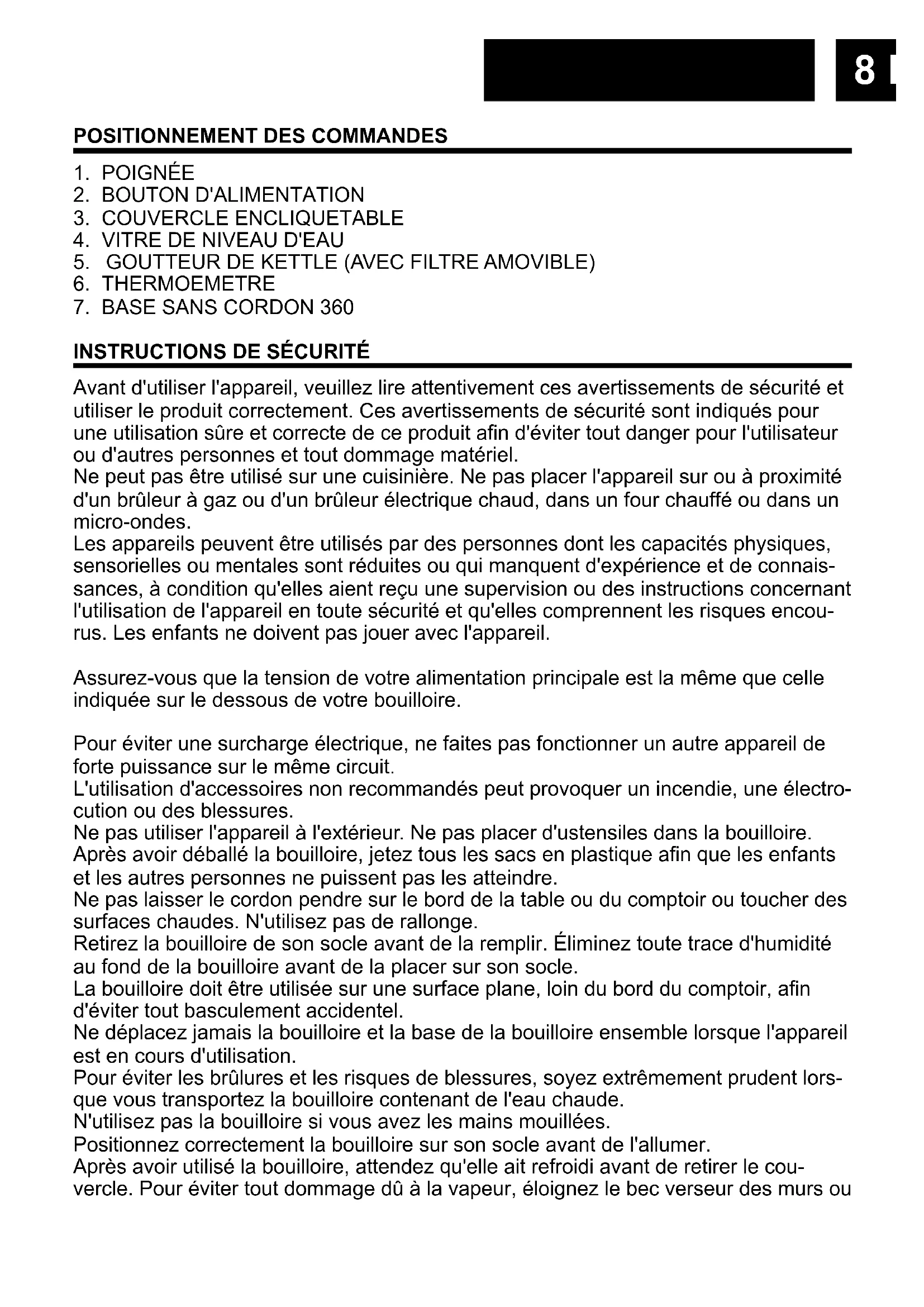 Avant d'utiliser l'appareil, veuillez lire attentivement ces avertissements de sécurité et utiliser le produit correctement. Ces avertissements de sécurité sont indiqués pour une utilisation sûre et correcte de ce produit afin d'éviter tout danger pour l'utilisateur ou d'autres personnes et tout dommage matériel. Ne peut pas être utilisé sur une cuisinière. Ne pas placer l'appareil sur ou à proximité d'un brûleur à gaz ou d'un brûleur électrique chaud, dans un four chauffé ou dans un micro-ondes. Les appareils peuvent être utilisés par des personnes dont les capacités physiques, sensorielles ou mentales sont réduites ou qui manquent d'expérience et de connais- sances, à condition qu'elles aient reçu une supervision ou des instructions concernant l'utilisation de l'appareil en toute sécurité et qu'elles comprennent les risques encou- rus. Les enfants ne doivent pas jouer avec l'appareil. Assurez-vous que la tension de votre alimentation principale est la même que celle indiquée sur le dessous de votre bouilloire. Pour éviter une surcharge électrique, ne faites pas fonctionner un autre appareil de forte puissance sur le même circuit. L'utilisation d'accessoires non recommandés peut provoquer un incendie, une électro- cution ou des blessures. Ne pas utiliser l'appareil à l'extérieur. Ne pas placer d'ustensiles dans la bouilloire. Après avoir déballé la bouilloire, jetez tous les sacs en plastique afin que les enfants et les autres personnes ne puissent pas les atteindre. Ne pas laisser le cordon pendre sur le bord de la table ou du comptoir ou toucher des surfaces chaudes. N'utilisez pas de rallonge. Retirez la bouilloire de son socle avant de la remplir. Éliminez toute trace d'humidité au fond de la bouilloire avant de la placer sur son socle. La bouilloire doit être utilisée sur une surface plane, loin du bord du comptoir, afin d'éviter tout basculement accidentel. Ne déplacez jamais la bouilloire et la base de la bouilloire ensemble lorsque l'appareil est en cours d'utilisation. Pour éviter les brûlures et les risques de blessures, soyez extrêmement prudent lors- que vous transportez la bouilloire contenant de l'eau chaude. N'utilisez pas la bouilloire si vous avez les mains mouillées. Positionnez correctement la bouilloire sur son socle avant de l'allumer. Après avoir utilisé la bouilloire, attendez qu'elle ait refroidi avant de retirer le cou- vercle. Pour éviter tout dommage dû à la vapeur, éloignez le bec verseur des murs ou9 Français des armoires pendant l'utilisation. Si vous posez le corps de la bouilloire sur une table, utilisez un coussin de protection sous la bouilloire après qu'elle a été chauffée afin d'éviter d'endommager les sur- faces. Pour réduire le risque d'incendie ou d'électrocution, ne retirez pas le couvercle infé- rieur de la base et ne démontez pas la base ou la bouilloire de quelque manière que ce soit. L'appareil ne contient aucune pièce pouvant être réparée par l'utilisateur. Les réparations doivent être effectuées uniquement par un personnel de service autorisé. L'ouverture de la base ou de la bouilloire entraîne l'annulation de la garantie de deux ans. Ne pas utiliser l'appareil en présence de fumées explosives et/ou inflammables. Ne pas utiliser la bouilloire à d'autres fins que celles prévues. Cet appareil est desti- né à un usage domestique uniquement. Sources d'alimentation ALIMENTATION Vous pouvez alimenter la bouilloire en branchant le cordon d'alimentation CA dans la prise CA d'une prise de courant CA murale. Vérifiez que la tension nominale de votre appareil correspond à la tension locale. Assurez-vous que le cordon d'alimentation CA est entièrement inséré dans l'appareil.