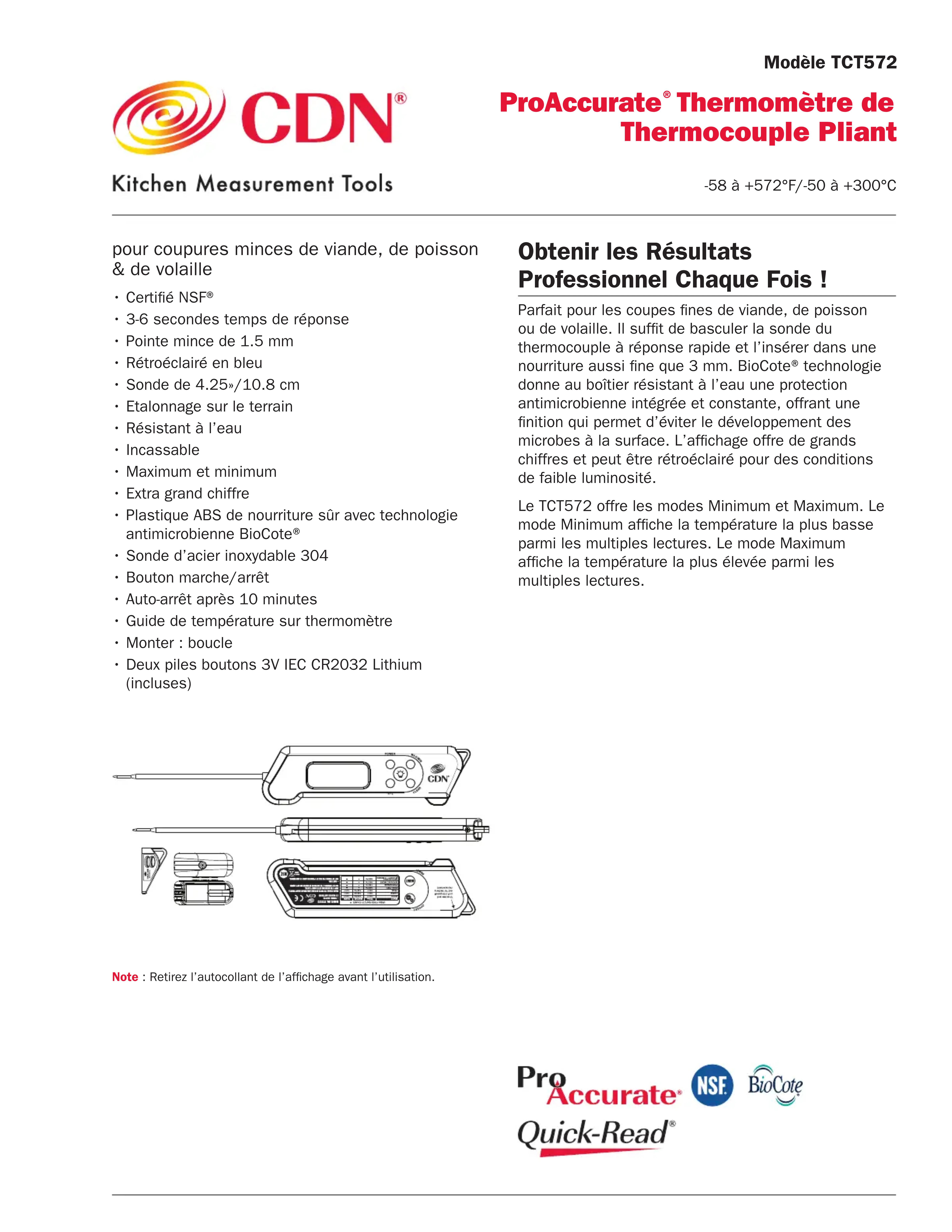 - Deux piles boutons 3V IEC CR2032 Lithium (incluses) Note : Retirez l’autocollant de l’afchage avant l’utilisation. Obtenir les Résultats Professionnel Chaque Fois ! Parfait pour les coupes nes de viande, de poisson ou de volaille. Il suft de basculer la sonde du thermocouple à réponse rapide et l’insérer dans une nourriture aussi ne que 3 mm. BioCote® technologie donne au boîtier résistant à l’eau une protection antimicrobienne intégrée et constante, offrant une nition qui permet d’éviter le développement des microbes à la surface. L’afchage offre de grands chiffres et peut être rétroéclairé pour des conditions de faible luminosité. Le TCT572 offre les modes Minimum et Maximum. Le mode Minimum afche la température la plus basse parmi les multiples lectures. Le mode Maximum afche la température la plus élevée parmi les multiples lectures. Modèle TCT572 ProAccurate