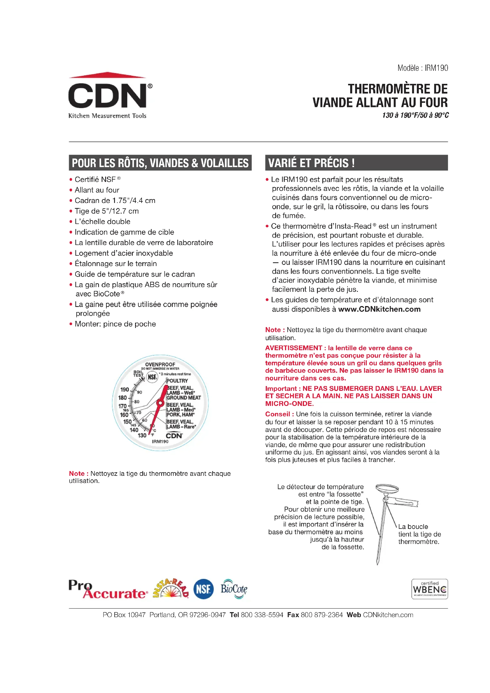 thermomètre n’est pas conçue pour résister à la température élevée sous un gril ou dans quelques grils de barbécue couverts. Ne pas laisser le IRM190 dans la nourriture dans ces cas. Important : NE PAS SUBMERGER DANS L’EAU. LAVER ET SECHER A LA MAIN. NE PAS LAISSER DANS UN MICRO-ONDE. Conseil : Une fois la cuisson terminée, retirer la viande du four et laisser la se reposer pendant 10 à 15 minutes avant de découper. Cette période de repos est nécessaire pour la stabilisation de la température intérieure de la viande, de même que pour assurer une redistribution uniforme du jus. En agissant ainsi, vos viandes seront à la fois plus juteuses et plus faciles à trancher. PO Box 10947 Portland, OR 97296-0947 Tel 800 338-5594 Fax 800 879-2364 Web CDNkitchen.com La boucle tient la tige de thermomètre. Le détecteur de température est entre “la fossette” et la pointe de tige. Pour obtenir une meilleure précision de lecture possible, il est important d’insérer la base du thermomètre au moins jusqu’à la hauteur de la fossette.COMMENT RECALIBRER VOTRE THERMOMÈTRE Un thermomètre à cadran bimétallique Insta-Read