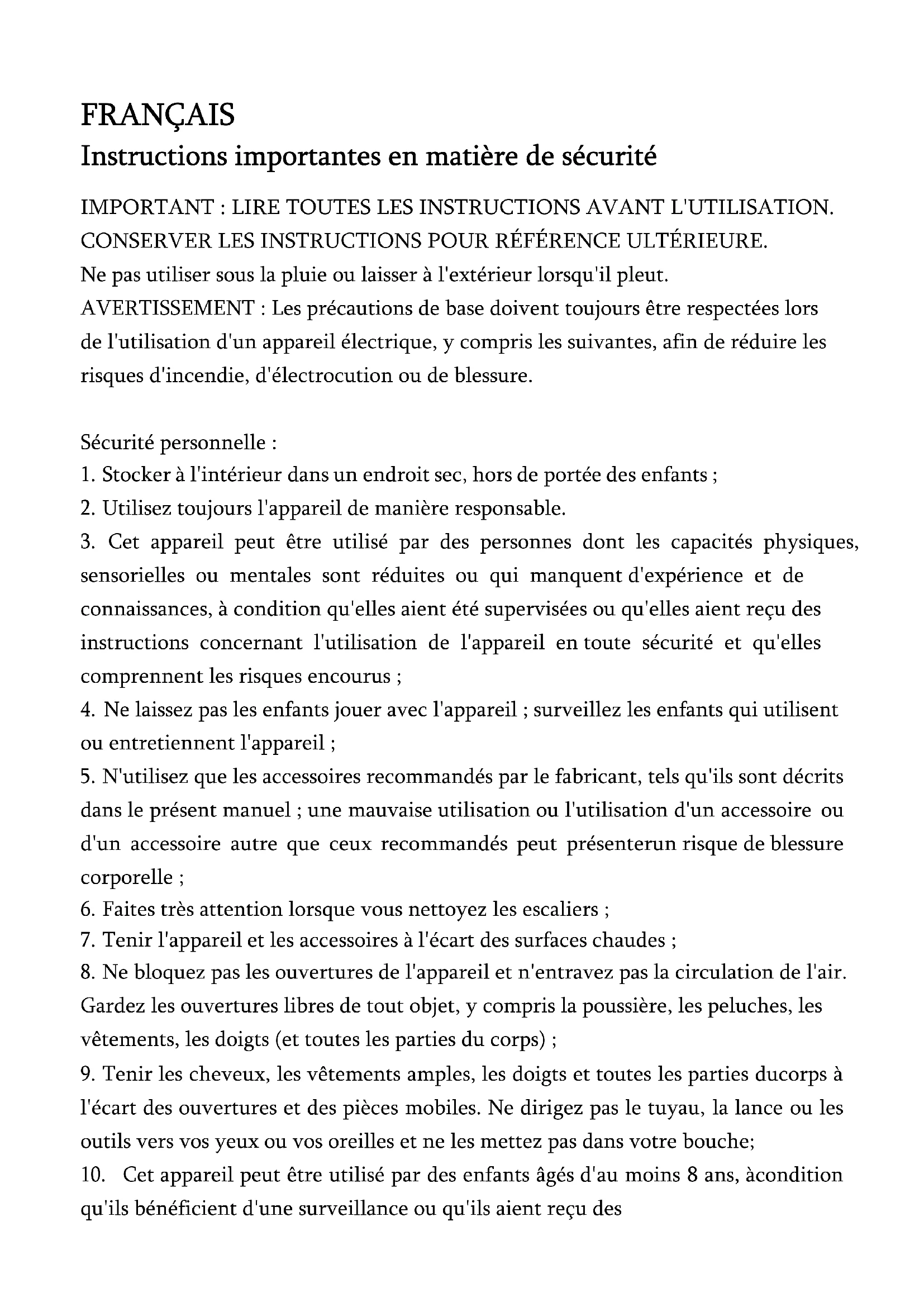Ne pas utiliser pour ramasser de l'eau25. Ne pas utiliser pour ramasser des liquides inflammables ou combustibles, tels que l'essence, ni dans des zones où ces liquides ou leurs vapeurs peuvent être présents