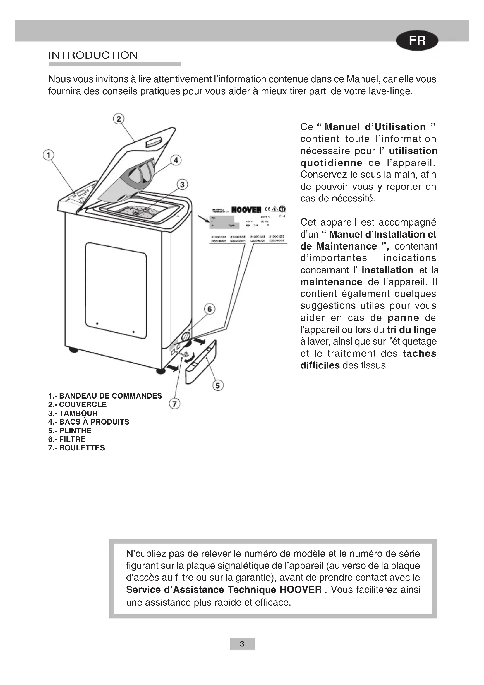 INTRODUCTION Nous vous invitons à lire attentivement l’information contenue dans ce Manuel, car elle vous fournira des conseils pratiques pour vous aider à mieux tirer parti de votre lave-linge. N’oubliez pas de relever le numéro de modèle et le numéro de série figurant sur la plaque signalétique de l’appareil (au verso de la plaque d’accès au filtre ou sur la garantie), avant de prendre contact avec le Service d’Assistance Technique HOOVER . Vous faciliterez ainsi une assistance plus rapide et efficace. Ce “ Manuel d’Utilisation ” contient toute l’information nécessaire pour l’ utilisation quotidienne de l’appareil. Conservez-le sous la main, afin de pouvoir vous y reporter en cas de nécessité. Cet appareil est accompagné d’un “ Manuel d’Installation et de Maintenance ”, contenant d’importantes indications concernant l’ installation et la maintenance de l’appareil. Il contient également quelques suggestions utiles pour vous aider en cas de panne de l’appareil ou lors du tri du linge à laver, ainsi que sur l’étiquetage et le traitement des taches difficiles des tissus.