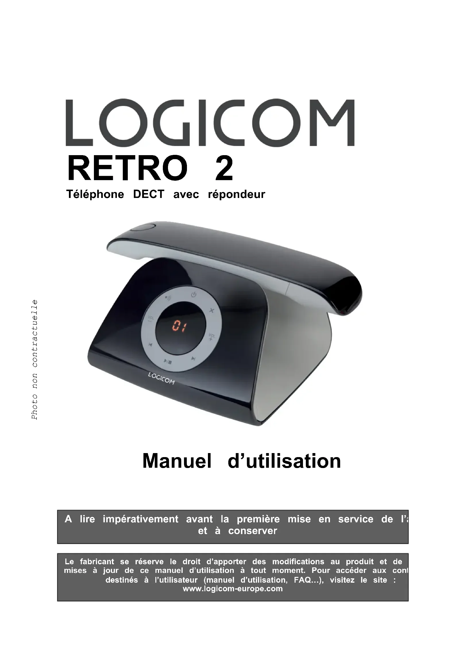 RETRO 2 Téléphone DECT avec répondeur Manuel d’utilisation Le fabricant se réserve le droit d’apporter des modifications au produit et de publier desmises à jour de ce manuel d’utilisation à tout moment. Pour accéder aux contenus à jourdestinés à l’utilisateur (manuel d’utilisation, FAQ…), visitez le site :www.logicom-europe.com A lire impérativement avant la première mise en service de l’appareil, et à conserver Photo non contractuelle1