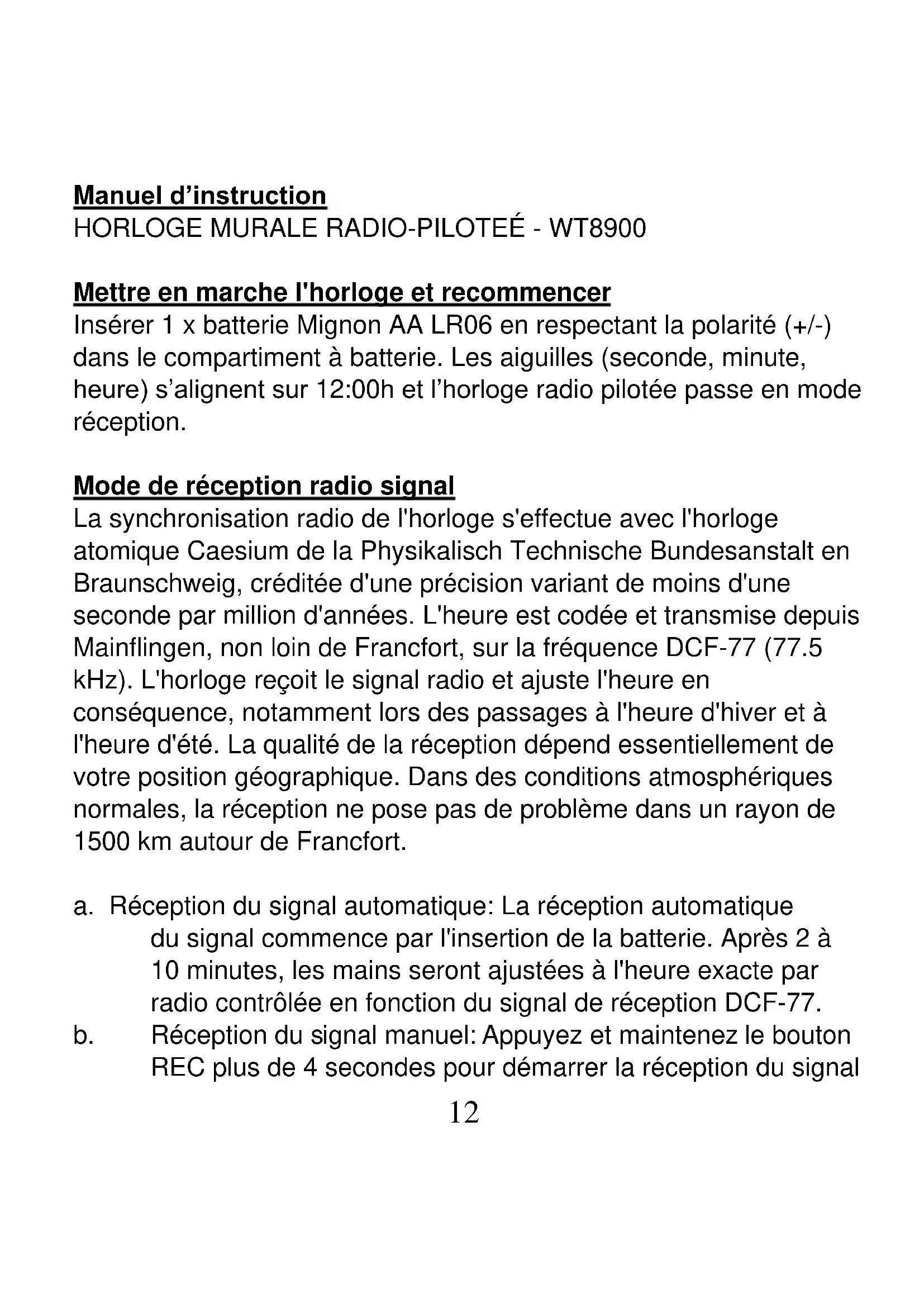 Mettre en marche l'horloge et recommencer Insérer 1 x batterie Mignon AA LR06 en respectant la polarité (+/-) dans le compartiment à batterie. Les aiguilles (seconde, minute, heure) s’alignent sur 12:00h et l’horloge radio pilotée passe en mode réception. Mode de réception radio signal La synchronisation radio de l'horloge s'effectue avec l'horloge atomique Caesium de la Physikalisch Technische Bundesanstalt en Braunschweig, créditée d'une précision variant de moins d'une seconde par million d'années. L'heure est codée et transmise depuis Mainflingen, non loin de Francfort, sur la fréquence DCF-77 (77.5 kHz). L'horloge reçoit le signal radio et ajuste l'heure en conséquence, notamment lors des passages à l'heure d'hiver et à l'heure d'été. La qualité de la réception dépend essentiellement de votre position géographique. Dans des conditions atmosphériques normales, la réception ne pose pas de problème dans un rayon de 1500 km autour de Francfort. a. Réception du signal automatique: La réception automatique du signal commence par l'insertion de la batterie. Après 2 à 10 minutes, les mains seront ajustées à l'heure exacte par radio contrôlée en fonction du signal de réception DCF-77. b. Réception du signal manuel: Appuyez et maintenez le bouton REC plus de 4 secondes pour démarrer la réception du signal13 manuel. Les aiguilles (seconde, minute, heure) s’alignent sur 12:00h et l’horloge radio pilotée passe en mode réception. Si le signal est reçu avec succès, les aiguilles s'ajustent automatiquement à l'heure exacte par radio contrôlée. Cette procédure prend environ 2 à 10 minutes. Si la réception du signal est omis, l'horloge continue de fonctionner à partir de l'heure d'origine. Après la prochaine réception du signal de succès l’heure s’ajuste automatiquement à l'heure exacte par radio contrôlée en fonction du signal de réception DCF-77.